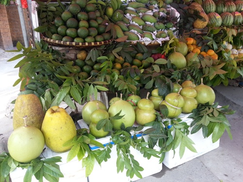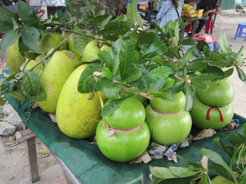 | Đào tiên, bưởi bầu dục bắt đầu được bày bán tại phố Linh Đàm. |