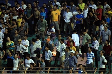 | Khán giả Thanh Hóa phản ứng sau tình huống trọng tài công nhận bàn thắng gây tranh cãi của XT Sài Gòn. |