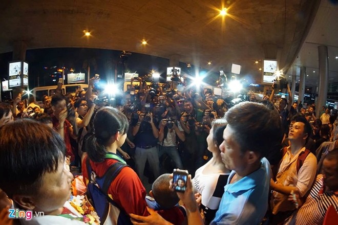 | Ánh Viên được người hâm mộ đón tiếp ở sân bay. Ảnh: Hạo Thái. |