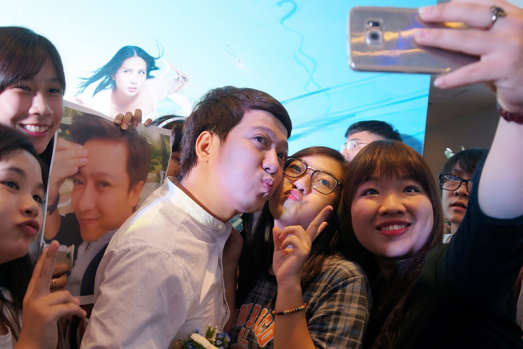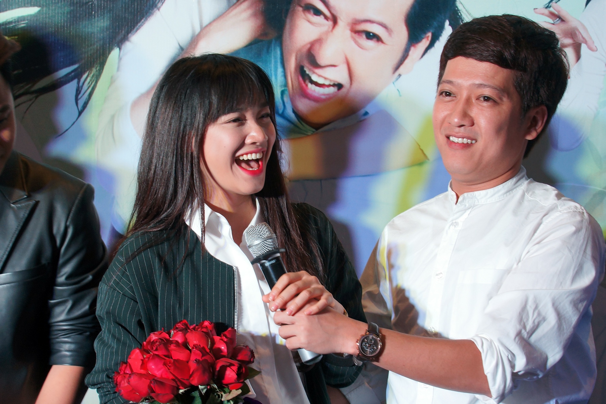 | Khác hình ảnh lộng lẫy trong buổi ra mắt ở TP HCM cách đây một ngày, Trường Giang và Nhã Phương xuất hiện tại Royal City với trang phục trầm và đơn giản hơn. Tuy nhiên, có một điều không thay đổi đó chính là cái nắm tay đầy tình cảm và không rời của cặp đôi. |