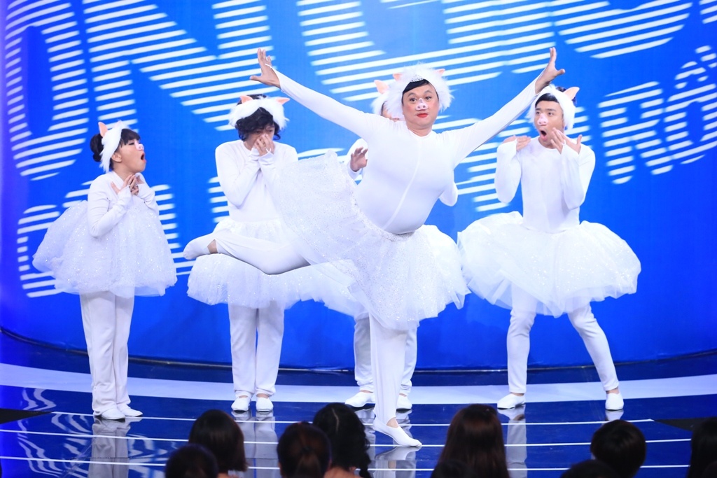 | Trong lúc 4 chú thiên nga heo đang nhảy múa hăng say, một nhân vật lạ mặt cùng ngoại hình tròn vo bước ra với vương miện lấp lánh trên đầu khiến mọi người bất ngờ. Chí Tài trong vai “hoa hậu thiên nga heo” sẽ thu hút khán giả bởi phong cách chảnh chọe và nỗ lực thực hiện những động tác ballet “khó nhằn”. |