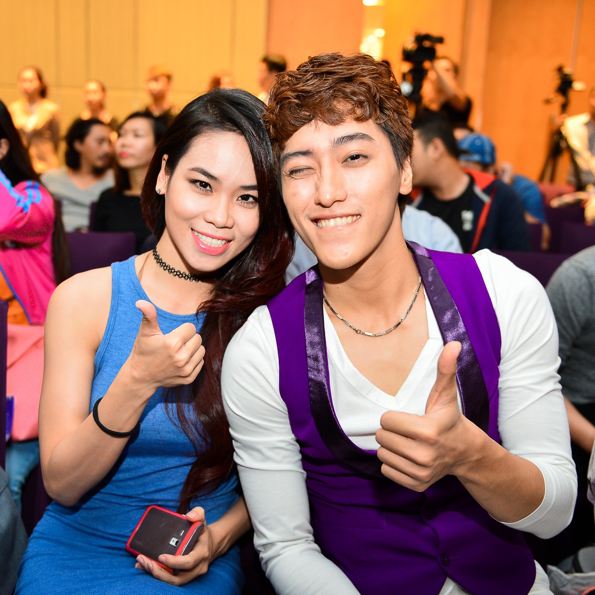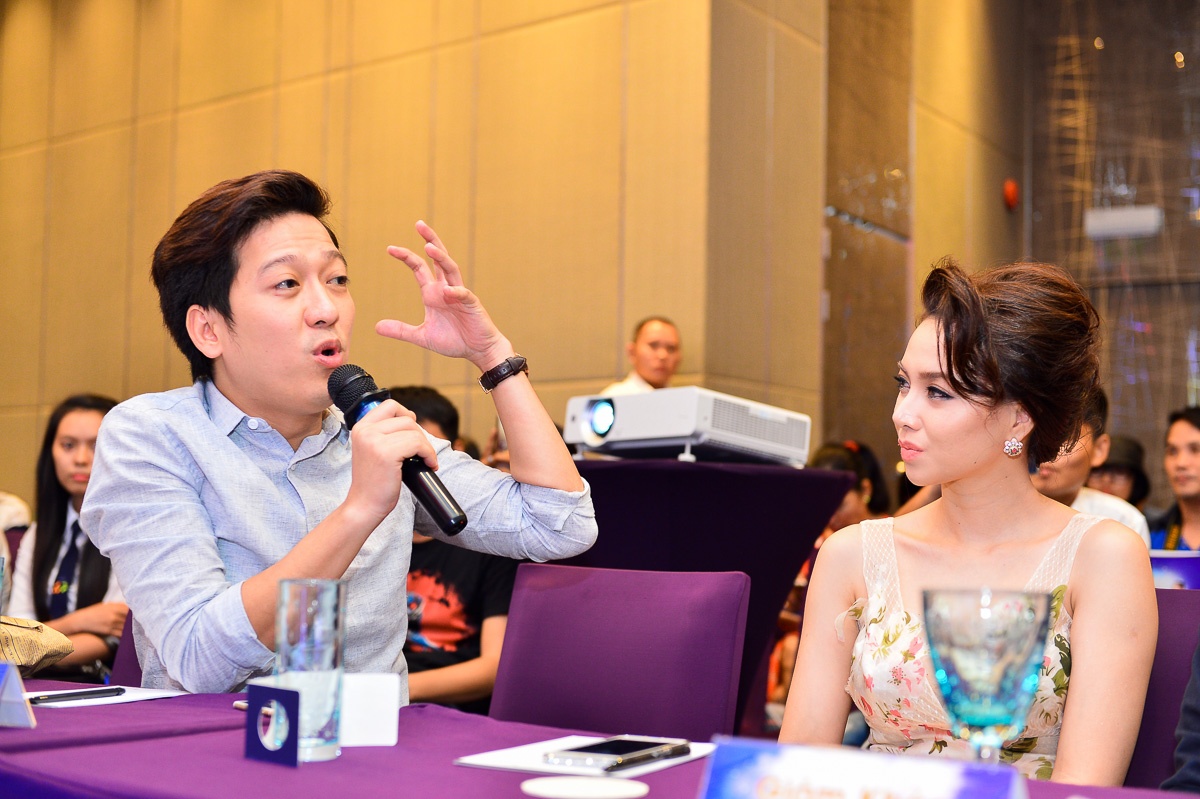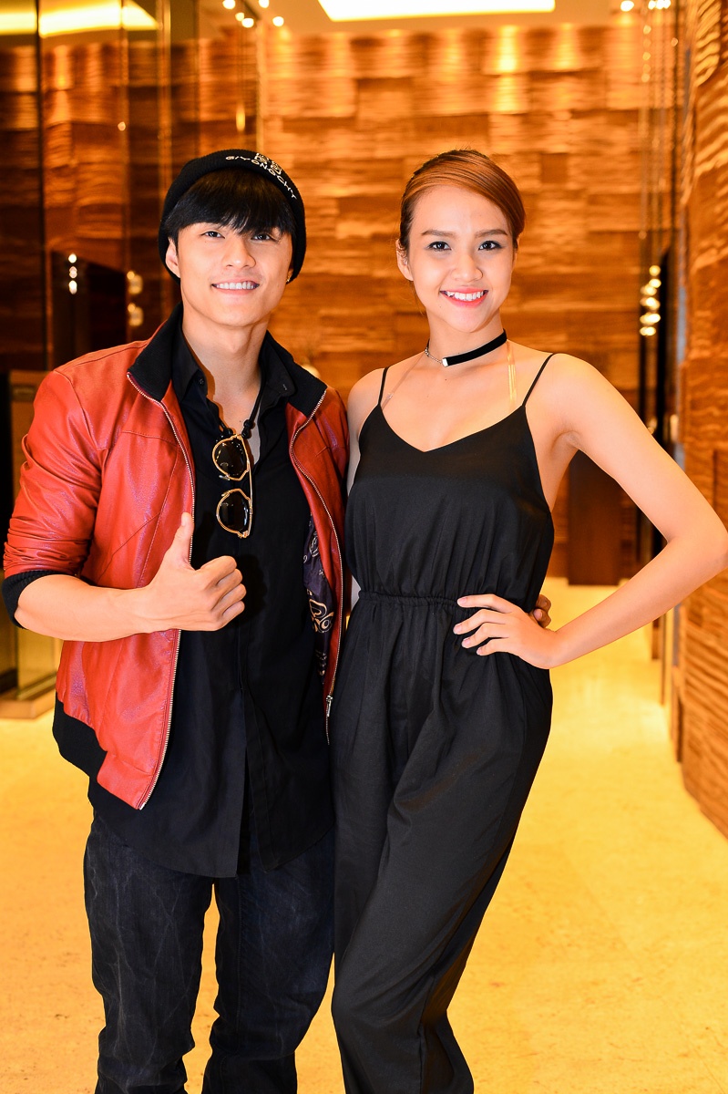 Cặp đôi Đình Lộc - Xuân Thảo tình cảm trong buổi họp báo. |