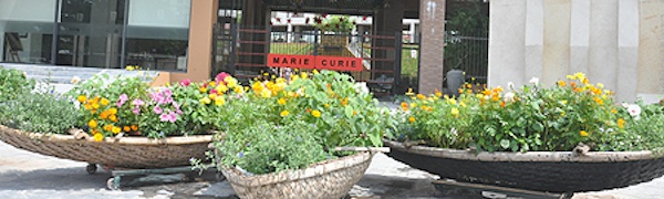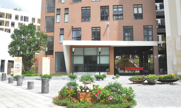 | Cây và hoa tại khu vực quảng trường của trường Marie Curie. |