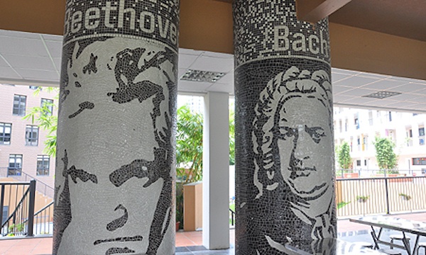 | Sảnh piano ở tầng 2 là nơi vui chơi của học sinh. Tại đây, các cột nhà được thiết kế in hình các nhà soạn nhạc nổi tiếng thế giới. "Trống" giữa giờ của học sinh tiểu học là các bản nhạc không lời. |