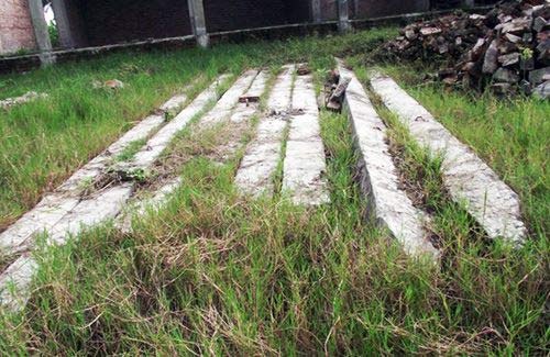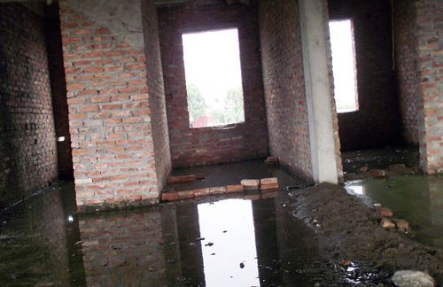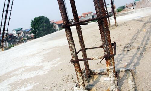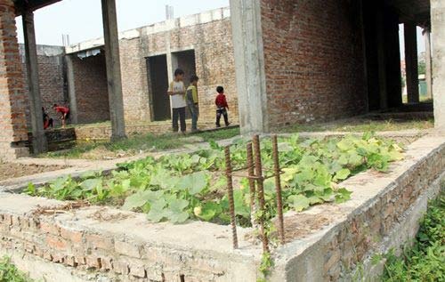 | Trong dãy nhà đang được xây dựng dở, tầng một cỏ mọc um tùm, thậm chí một số người dân còn trồng rau trên nền móng của trường. Sàn nhà ở tầng 2 nước đọng lênh láng khắp nơi, một số trụ cột trơ sắt qua nắng mưa đã bị hoen gỉ xuống cấp. |