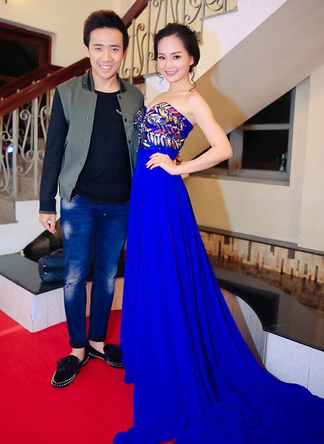 | Trấn Thành và Lan Phương chụp ảnh thân thiết trên thảm đỏ. Cặp đôi được giao nhiệm vụ dẫn dắt chương trình. Trái ngược với sự giản dị của MC Ơn giời, cậu đây rồi, Lan Phương khoe vóc dáng gầy sau thời gian giảm cân trong bộ cánh lộng lẫy của NTK Huy Trần. |