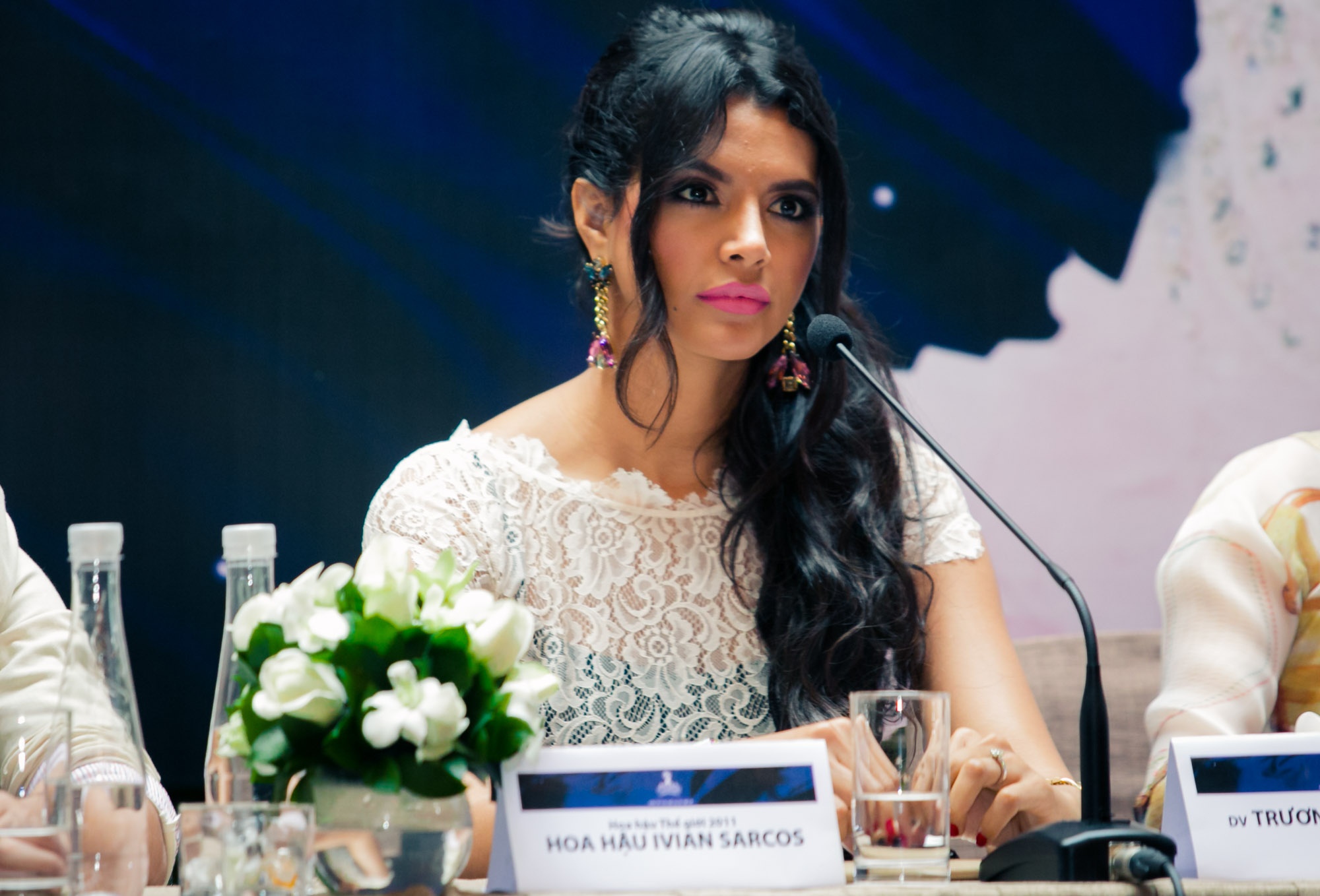 | Chiều ngày 4/1, tại TP.HCM, cuộc thi Hoa khôi Áo dài - Đường tới vương miện Hoa hậu Thế giới đã có buổi gặp gỡ báo chí, giới thiệu nội dung đêm chung kết diễn ra vào ngày 5/1. Thành phần ban giám khảo có Trương Ngọc Ánh, đạo diễn Quang Dũng và Hoa hậu Thế giới 2011 Ivian Sarcos đến Việt Nam để tham dự với vai trò giám khảo khách mời. Lần đầu đến Việt Nam đảm nhận vai trò "cần cân nảy mực", hoa hậu Ivian Sarcos tỏ ra khá thân thiện và cởi mở khi tiếp xúc giới truyền thông Việt. Trong buổi họp báo, người đẹp diện trang phục đơn giản, kín đáo, tôn vóc dáng hoàn hảo. |