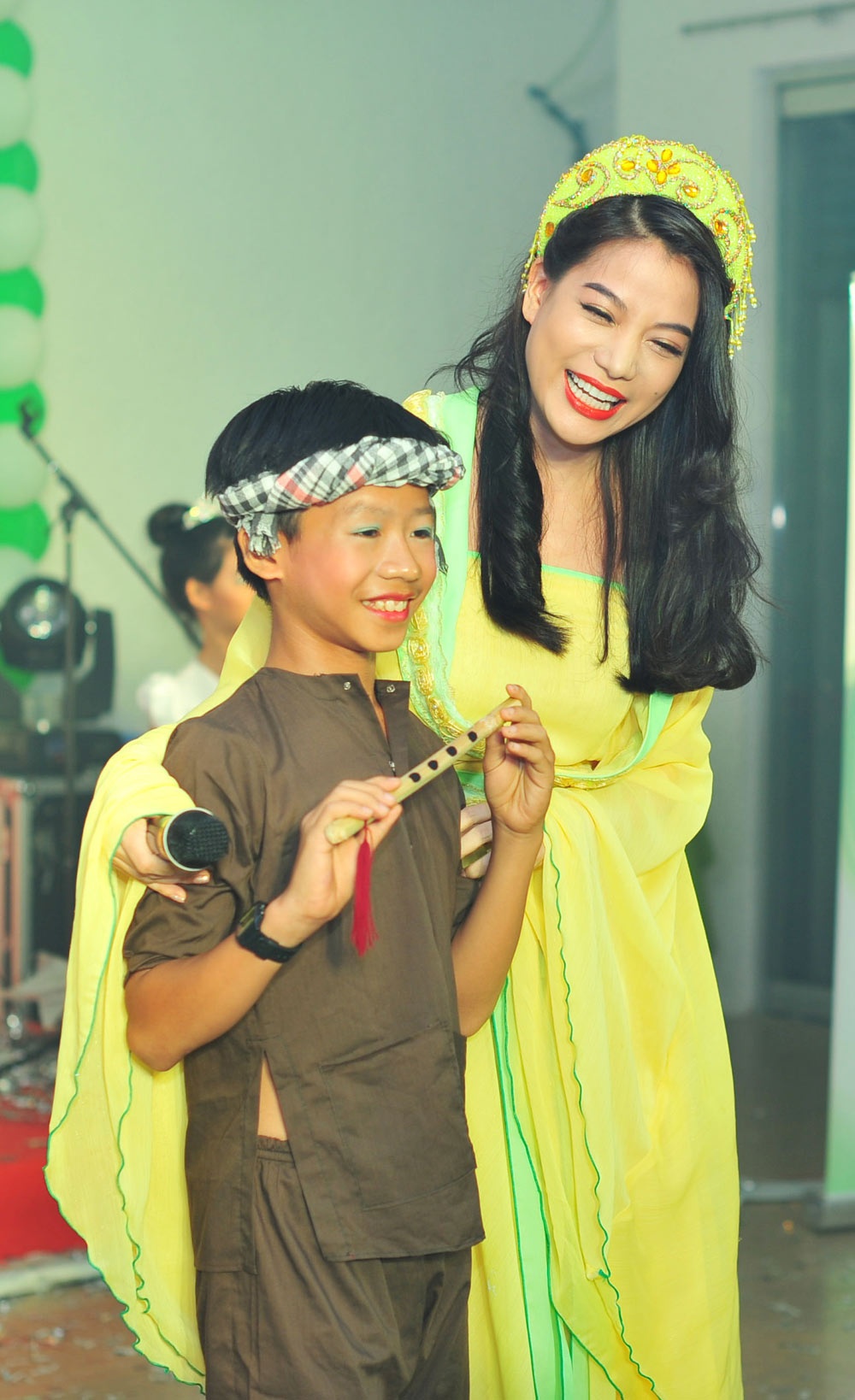 | Trương Ngọc Ánh vui vẻ bên một cậu nhóc đóng vai chú Cuội. |