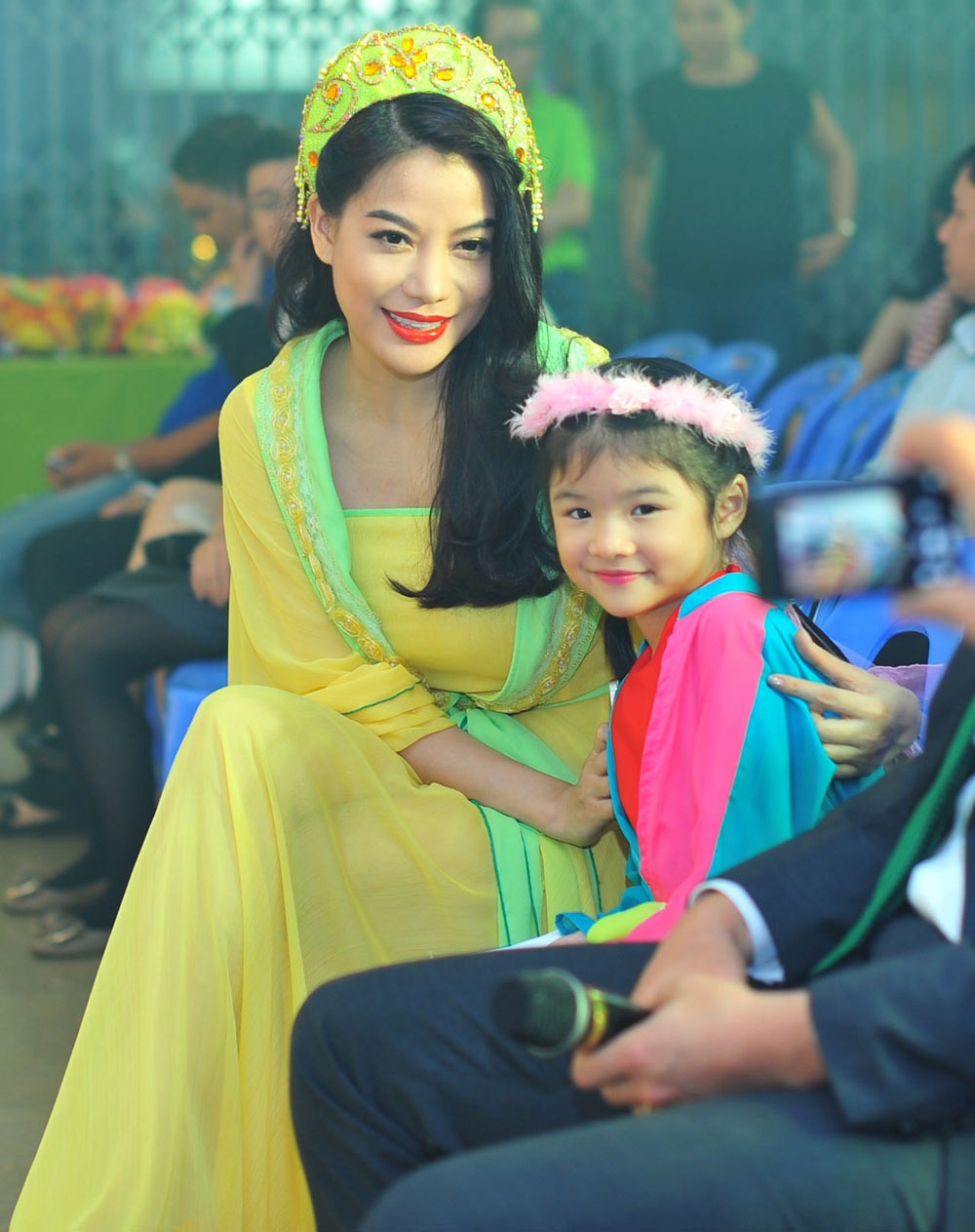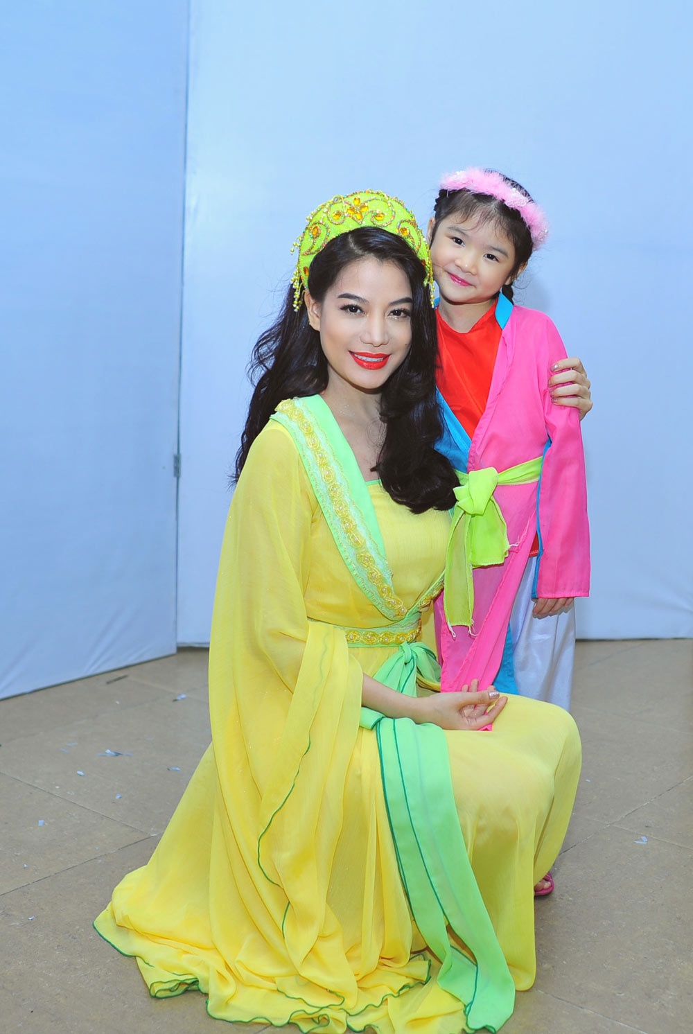 Trong khi nữ diễn viên hóa thân thành chị Hằng Nga thì con gái 6 tuổi cũng diện áo "mớ ba mớ bảy" đỏm dáng phát quà trung thu cho các em nhỏ.