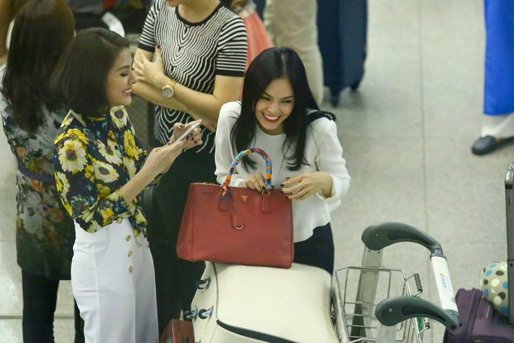 | Vân Trang và Cẩm Lynh vui mừng khi hội ngộ. Hai người đẹp trêu đùa, cười nói tại sân bay. |