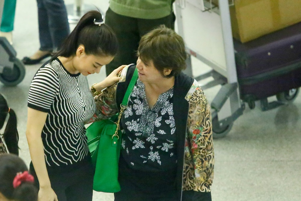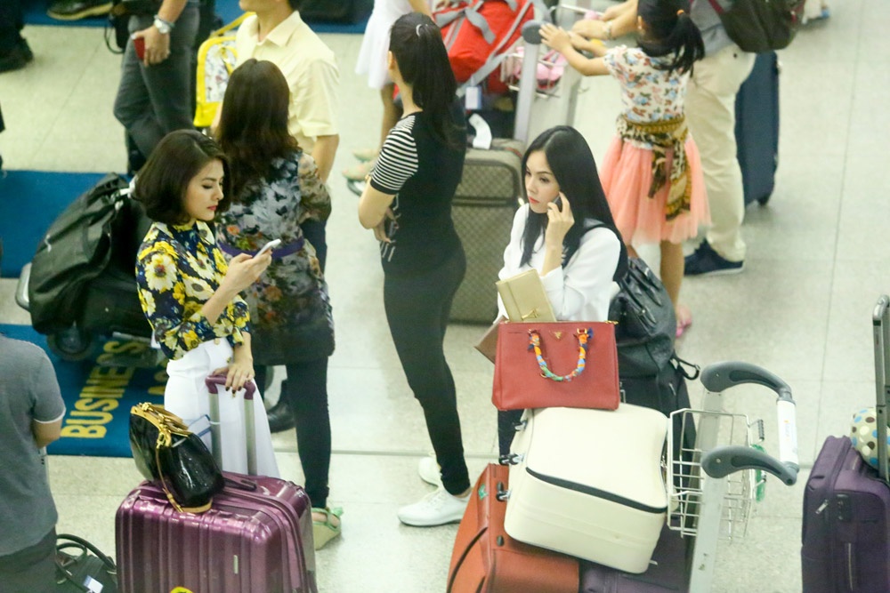 | Trương Ngọc Ánh và các diễn viên Vân Trang, Dương Cẩm Lynh đứng đợi làm thủ tục cho chuyến bay. |