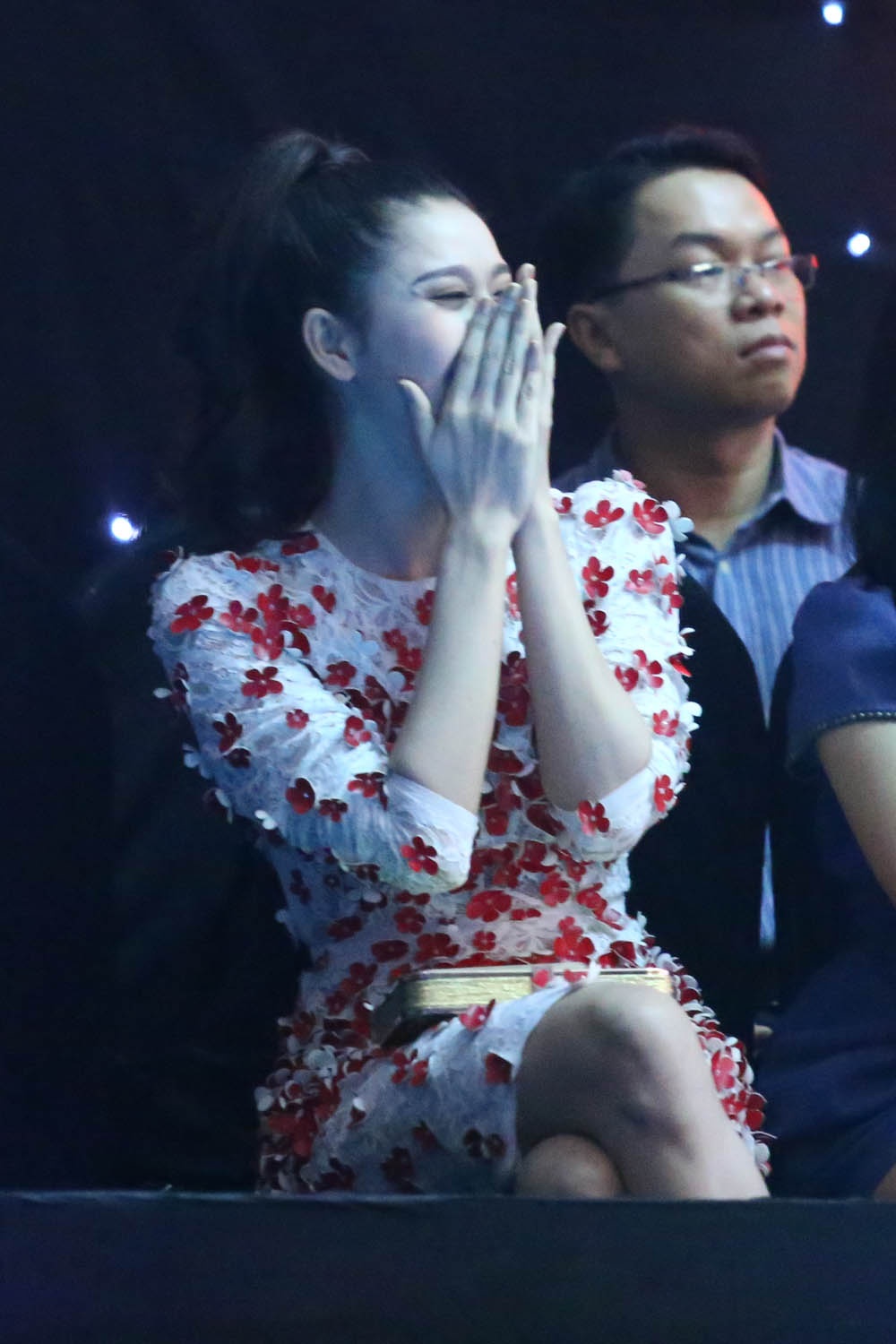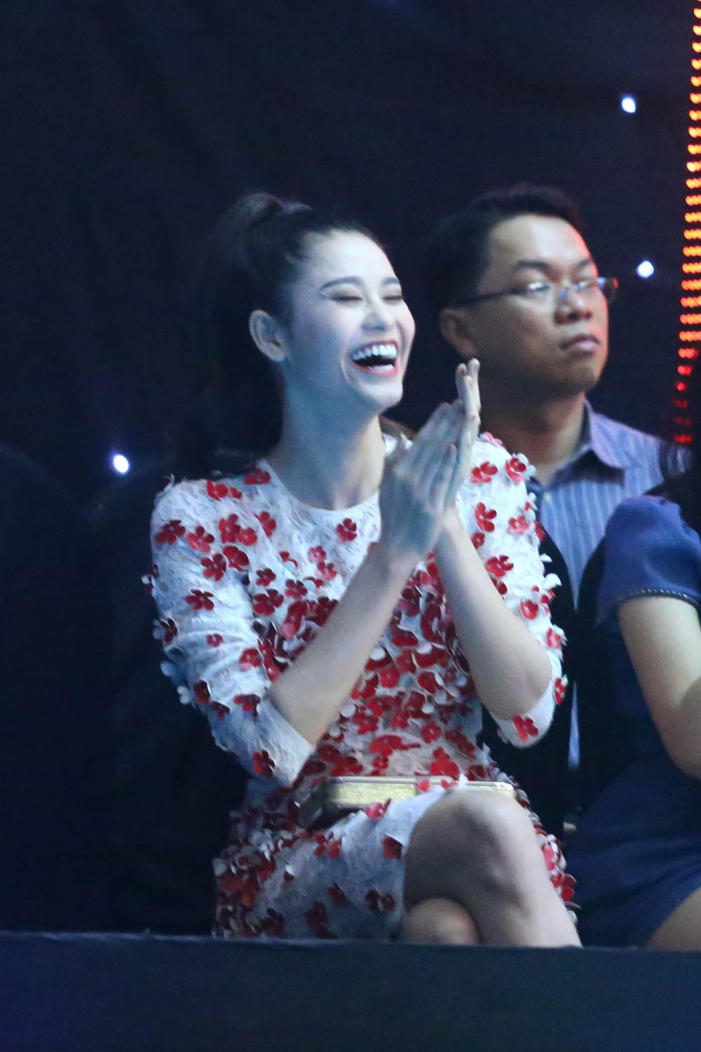 | Cô cười thích thú và liên tục vỗ tay ủng hộ Tim cùng Vicki cũng như nhóm vũ công phụ họa. |