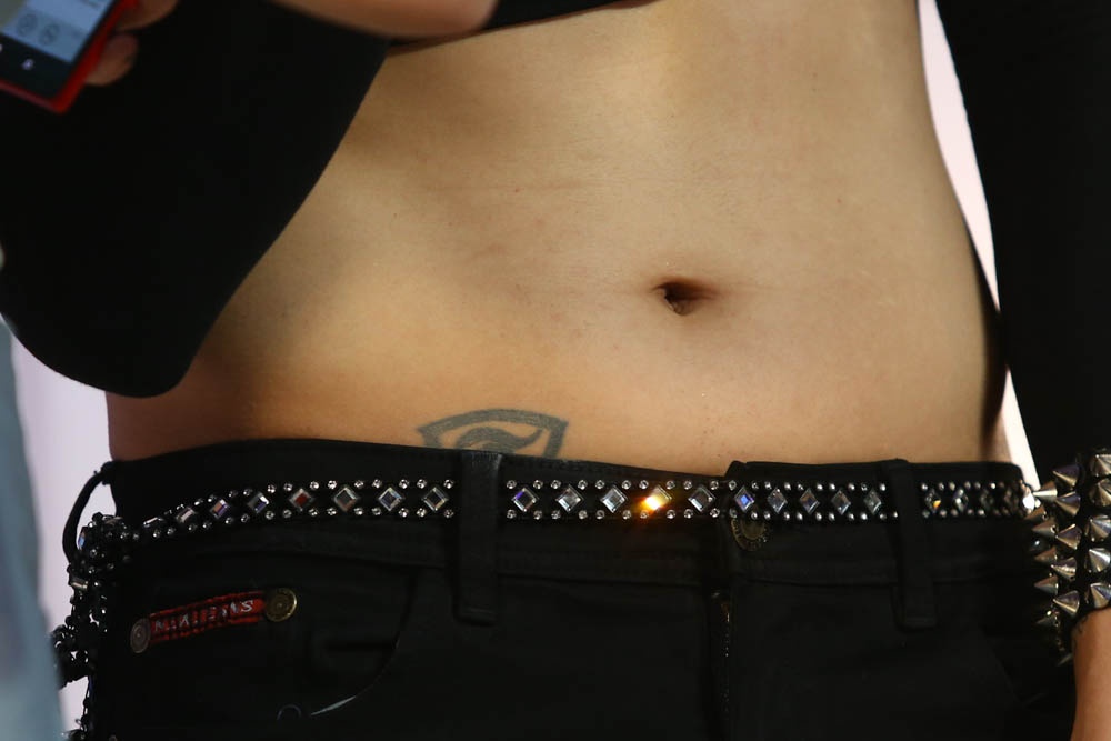 | Diện chiếc áo crop top và quần cạp trễ, Tim vô tình để lộ hình xăm ở vùng eo. Đây chính là chữ T cách điệu và đại diện cho nghệ danh của nam ca sĩ. Tim rất hiếm khi khoe hình xăm này. |