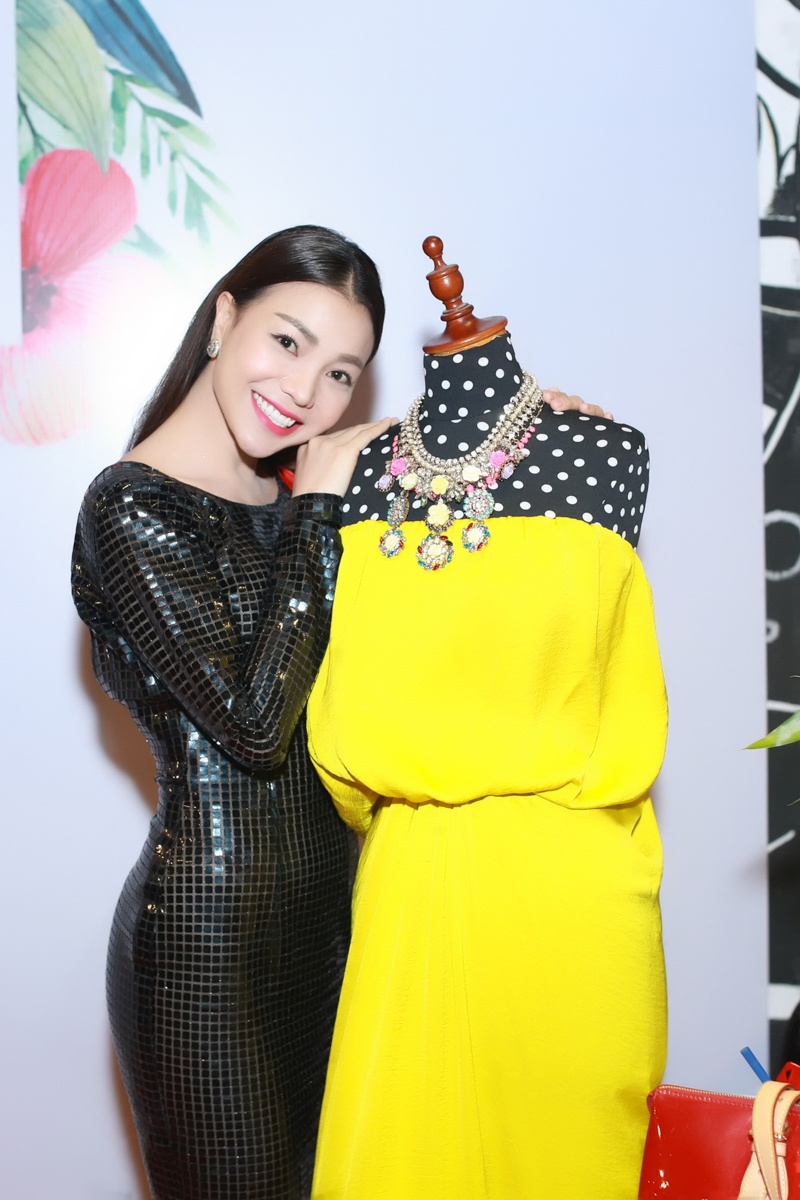 | Trà Ngọc Hằng đóng góp thiết kế của thương hiệu Lavin. Một doanh nhân mua lại váy lụa màu vàng chanh của ca sĩ - diễn viên với giá 12 triệu đồng. |