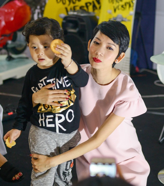 | Cô đưa con trai Sushi đi cùng. Cậu bé được mẹ mặc cho bộ đồ dáng thể thao khá thoải mái, màu tối khoe làn da búng ra sữa. |