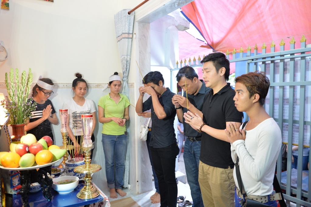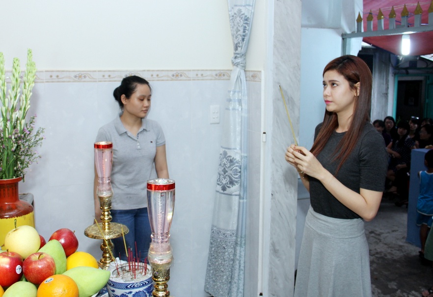 Trưa 29/7, nữ diễn viên "Cầu vồng đơn sắc" đến thắp nhang, cầu mong MC xấu số ra đi thanh thản.