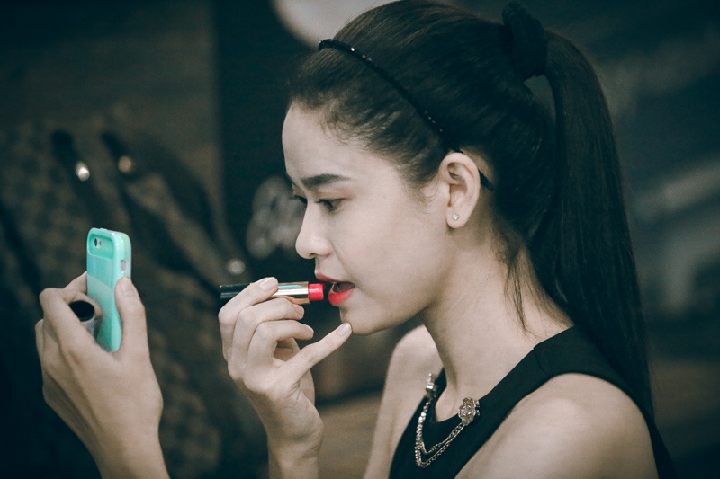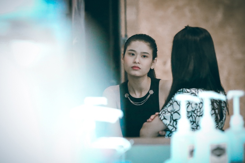 Trương Quỳnh Anh tranh thủ soi gương làm điệu trong lúc chờ đợi. Cô nhiều lần chia sẻ, kể từ ngày có bé Sushi, hiếm khi nào cô có thời gian rảnh rỗi đi uống cà phê cùng bạn bè, lúc nào cũng vội vàng về nhà chăm con.