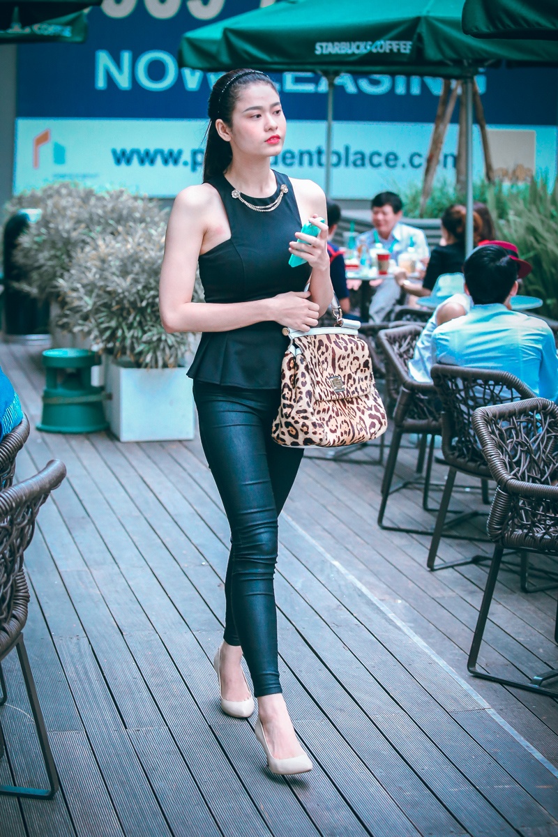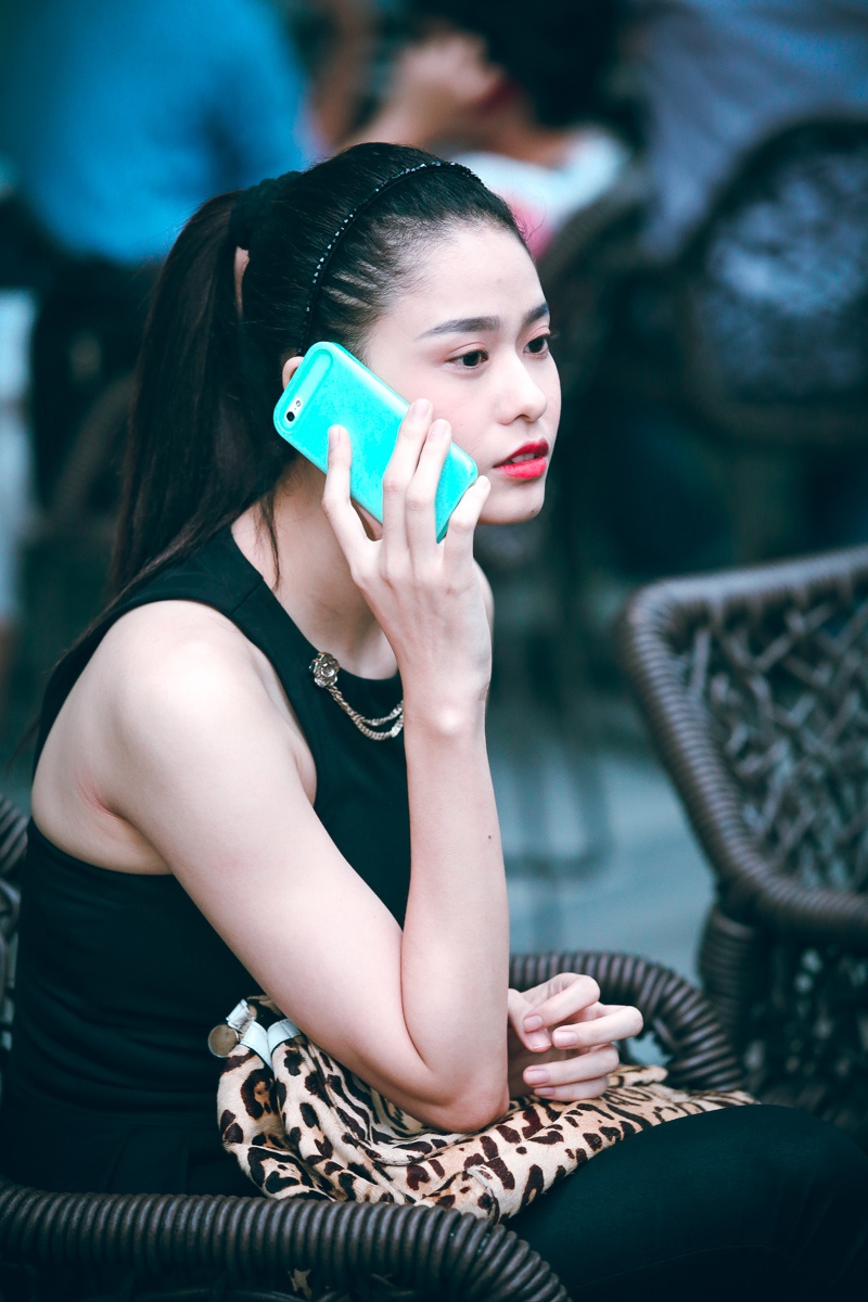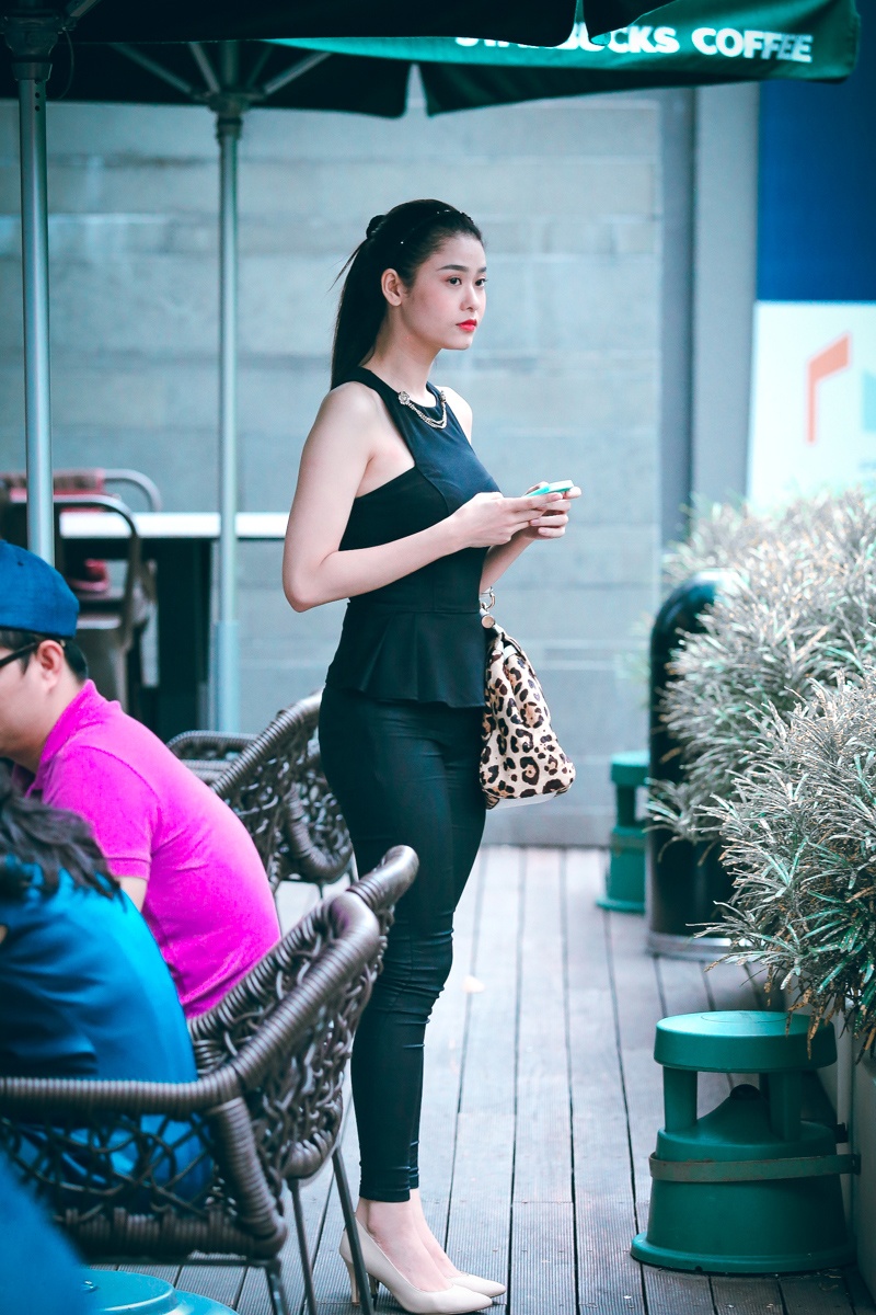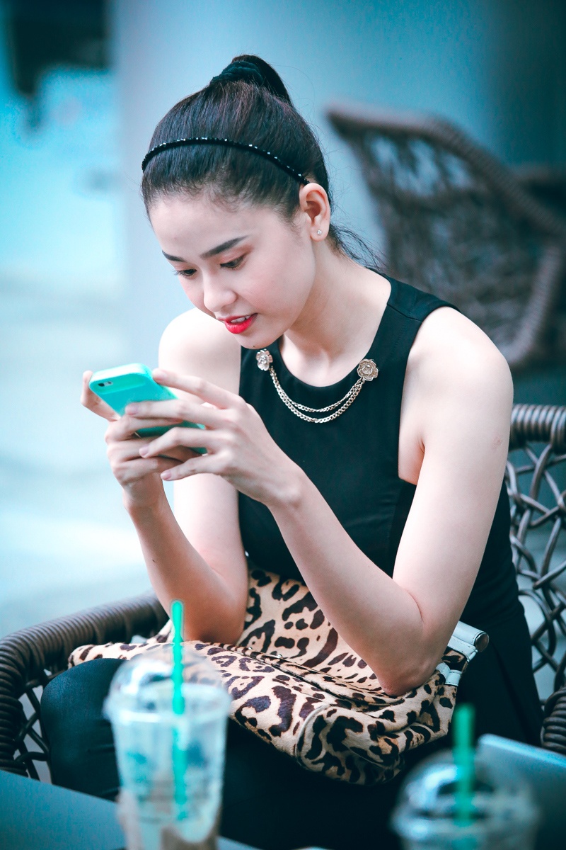 Bà xã của nam ca sĩ Tim mặc gọn gàng và trang điểm nhẹ nhàng, điểm nhấn trên gương mặt là đôi môi tô đậm. Cô một mình đến quán cà phê hẹn hò một người bạn. Nữ diễn viên tươi tắn khi ngồi chờ bạn đến điểm hẹn.