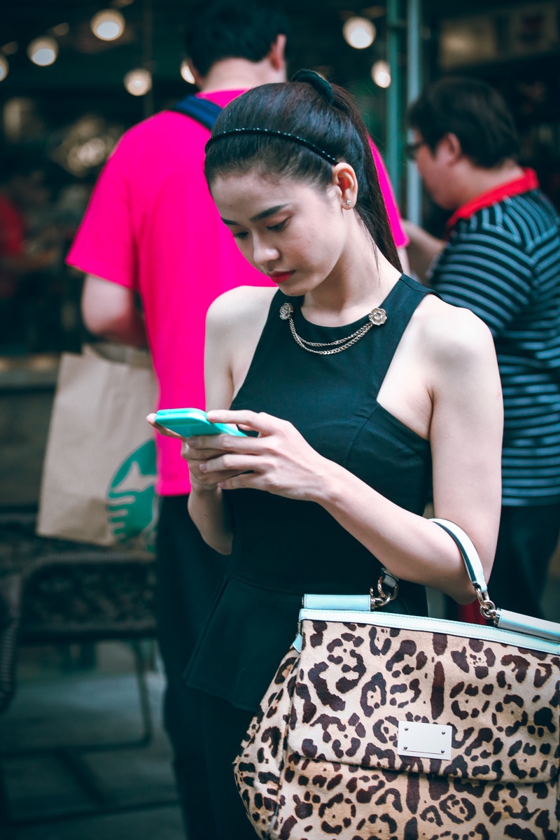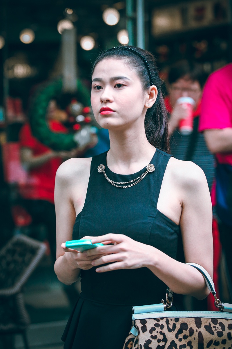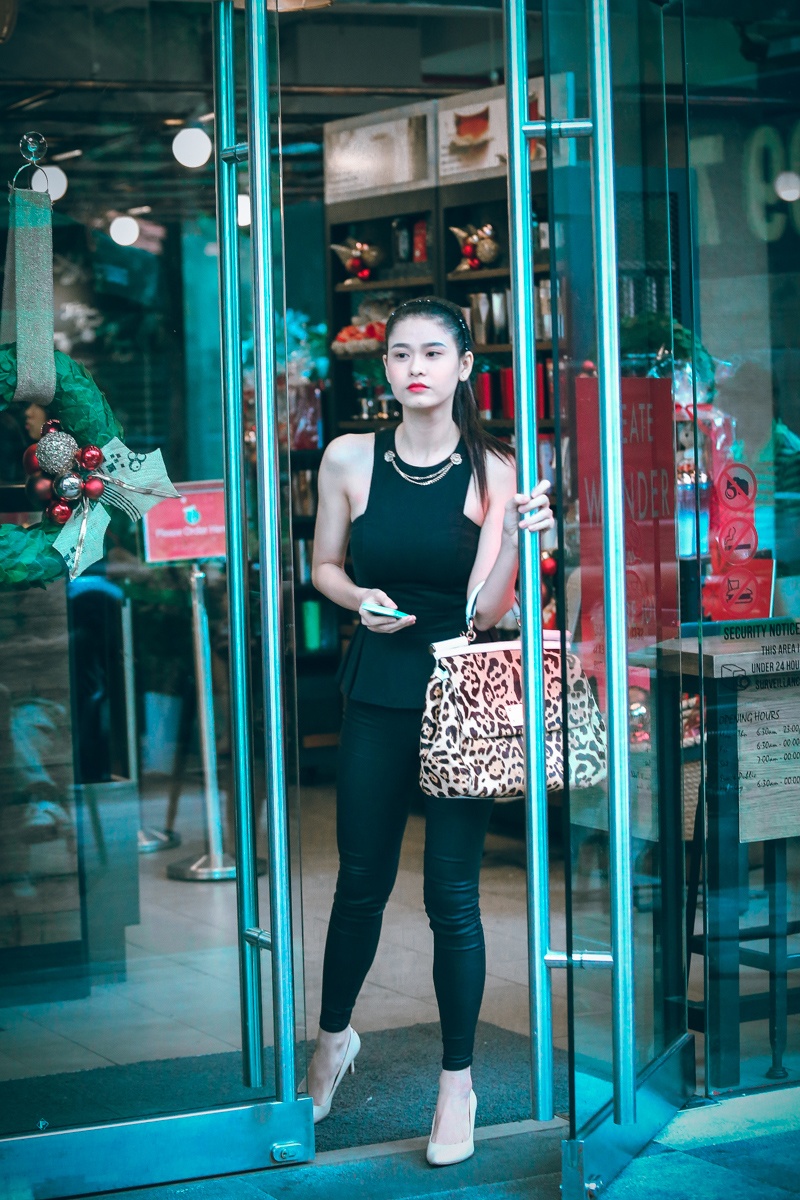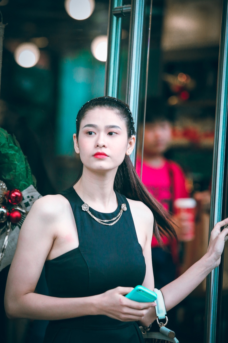 Bà xã của nam ca sĩ Tim mặc gọn gàng và trang điểm nhẹ nhàng, điểm nhấn trên gương mặt là đôi môi tô đậm. Cô một mình đến quán cà phê hẹn hò một người bạn. Nữ diễn viên tươi tắn khi ngồi chờ bạn đến điểm hẹn.