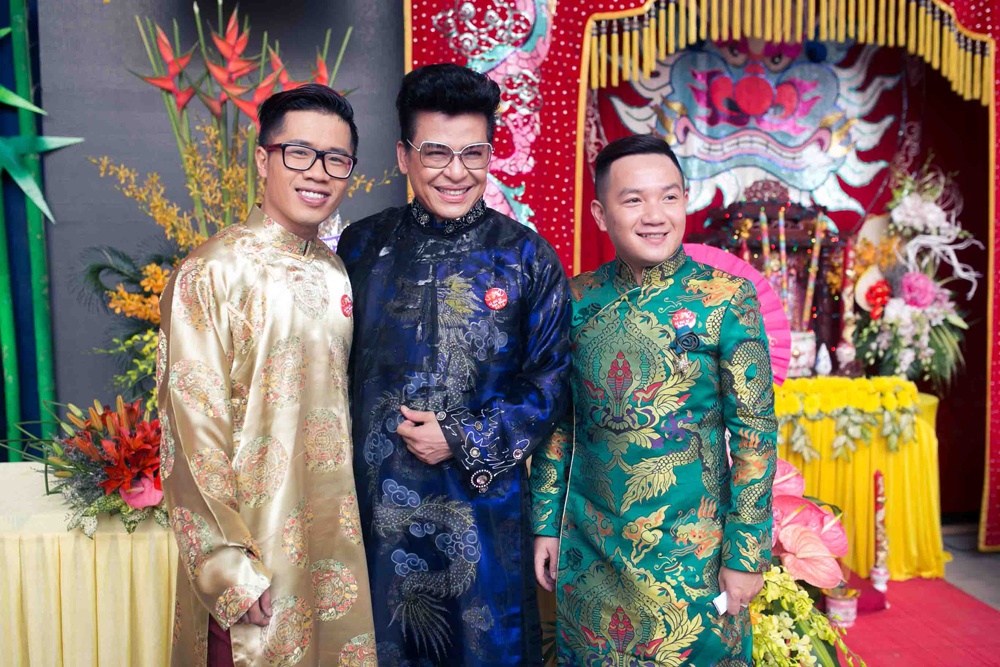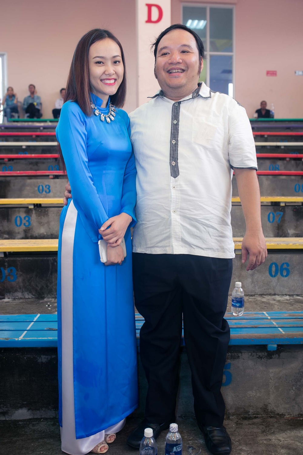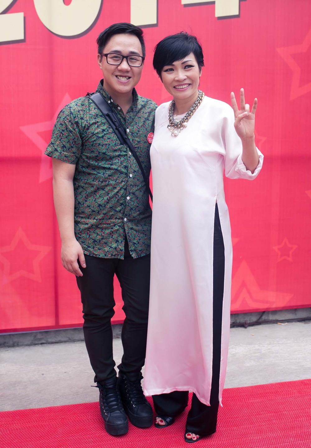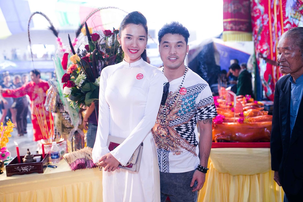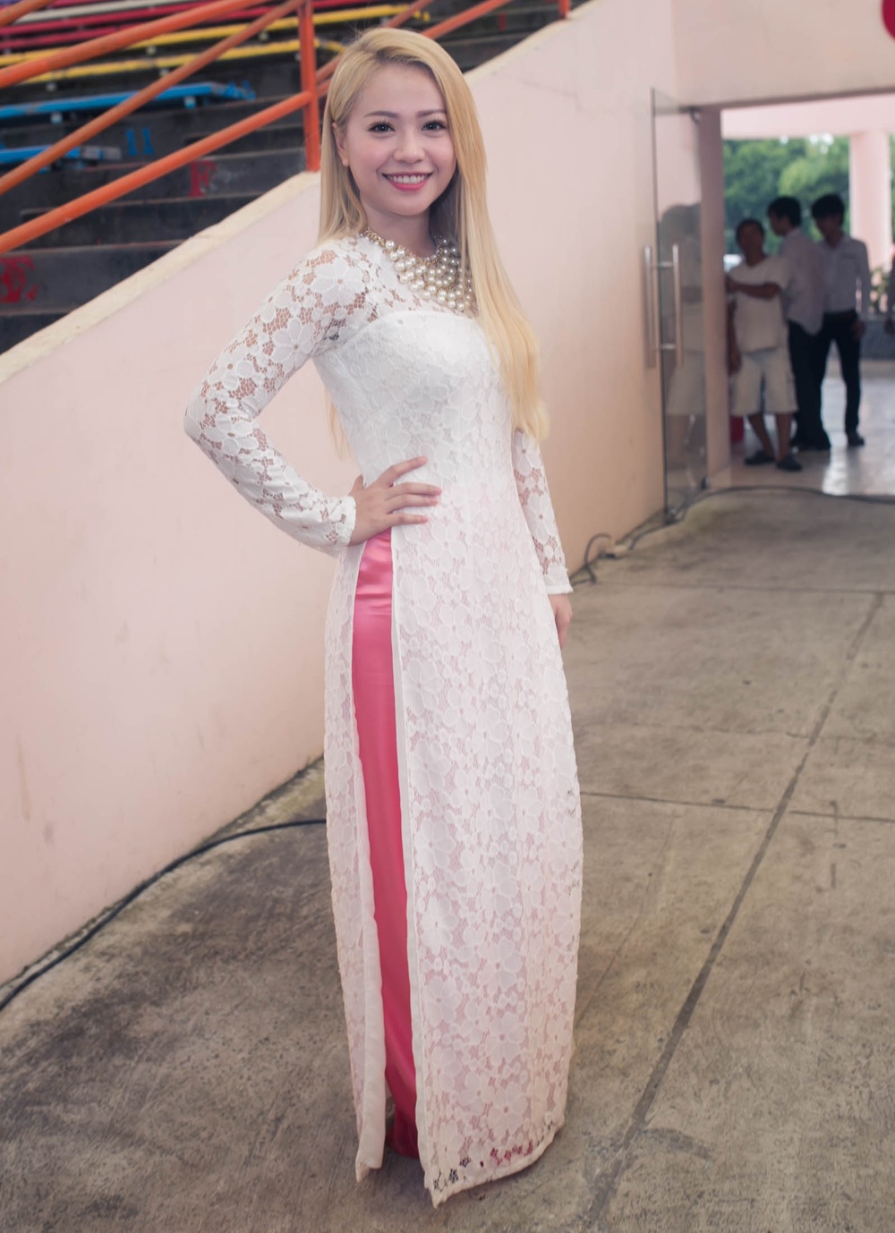 | Phương Thanh diện áo dài xuất hiện trong buổi lễ cùng nam ca sĩ trẻ Trung Quân. |