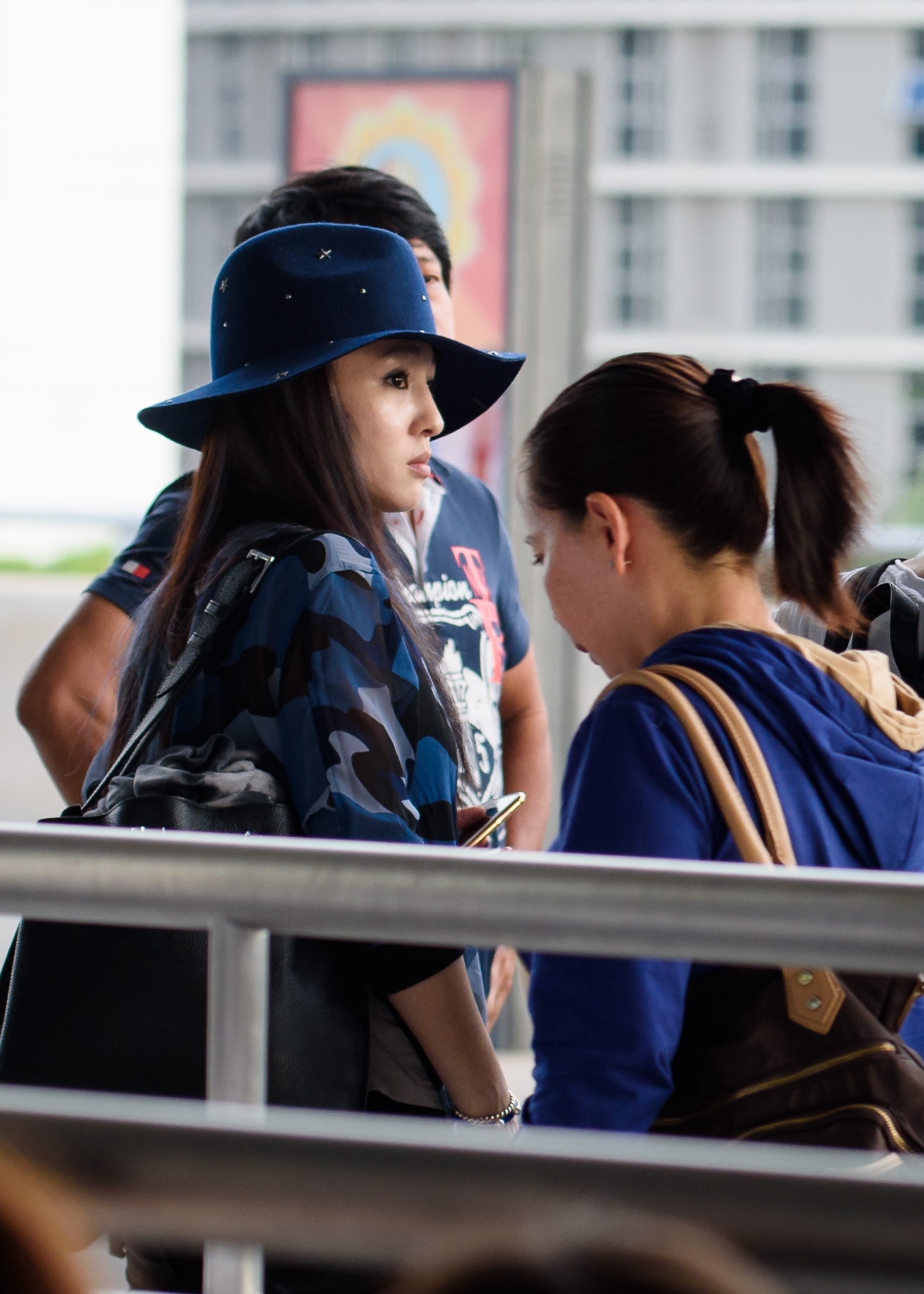 | Trương Thiều Hàm có mặt tại sảnh đi quốc tế của sân bay Tân Sơn Nhất trong bộ trang phục tông xanh. Cô rời Sài Gòn sau 4 ngày ghé thăm. |