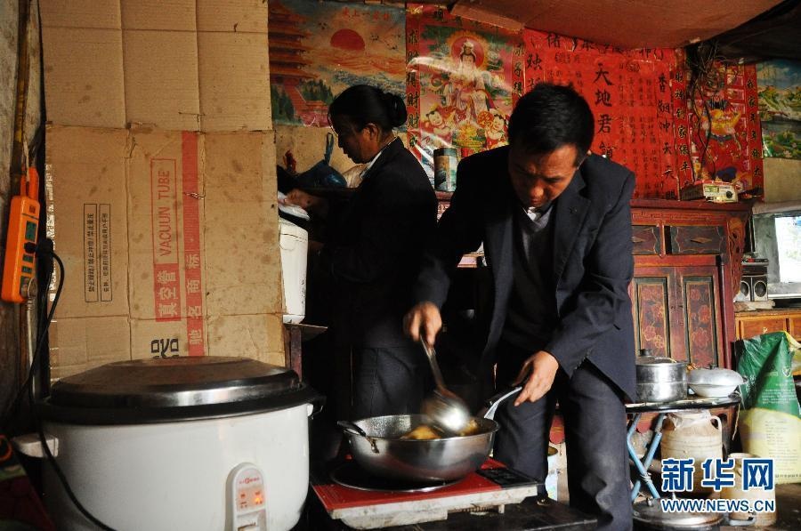 | Trong căn nhà nhỏ dưới chân núi, thầy Xie Bihua và vợ chuẩn bị thức ăn cho các học sinh. |