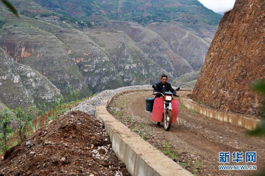 | Thầy Xie Bihua mang thức ăn cho học sinh. Hàng ngày, thầy chạy xe, vượt qua những con đường quanh co trên núi để đến trường. |
