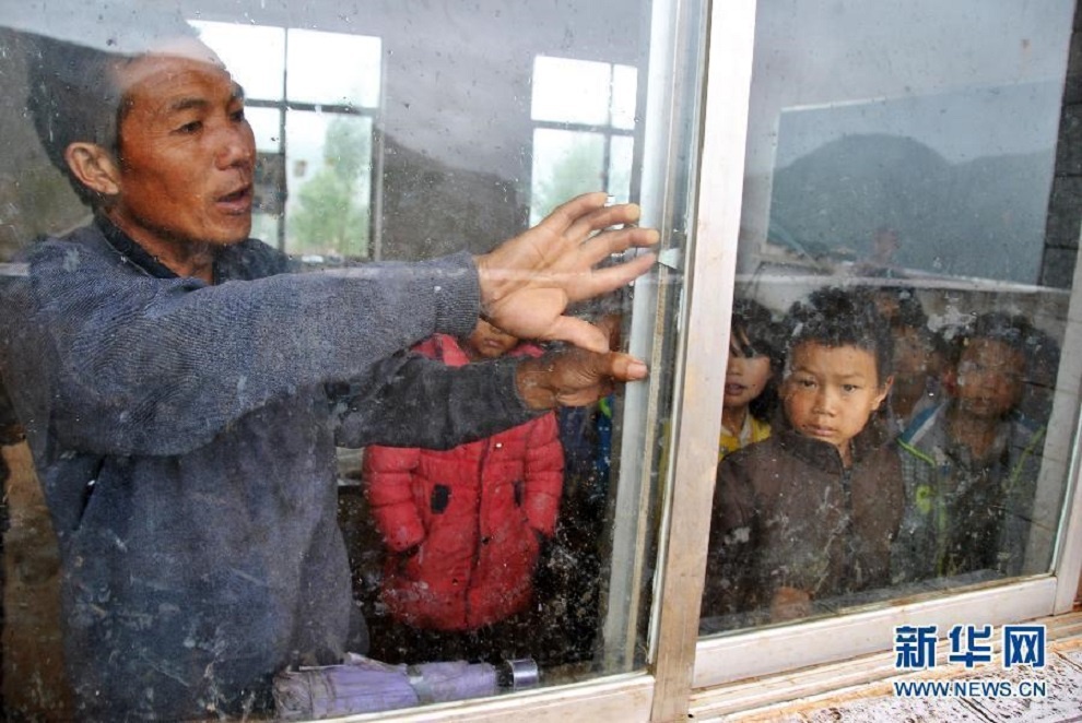 | Thầy Xie đóng cửa sổ để tránh mưa tạt vào lớp học. Thầy luôn chú ý cẩn thận đến việc bảo vệ sức khỏe cho học sinh. |