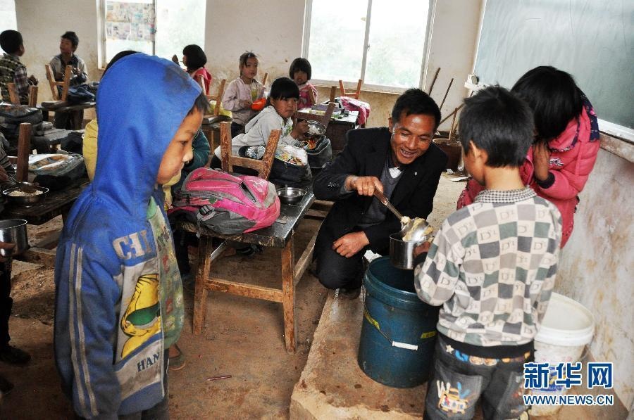 | Thầy Xie Bihua chia thức ăn cho học sinh. Dù trong giờ học hay giờ nghỉ, thầy luôn hòa nhã, đối xử nhẹ nhàng với học sinh. |