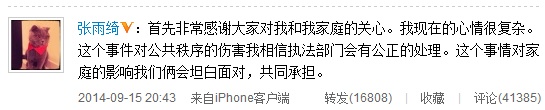 Sáng 15/9, làng giải trí Hoa ngữ xôn xao trước tin đạo diễn Vương Toàn An - chồng Trương Vũ Kỳ - bị bắt vì mua dâm. Tới 20h43' tối cùng ngày, nữ diễn viên sinh năm 1986 đã chính thức lên tiếng trên blog.
