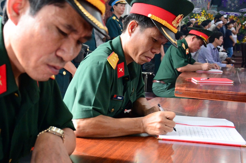 | Lãnh đạo Bộ Quốc phòng ghi sổ tang. |
