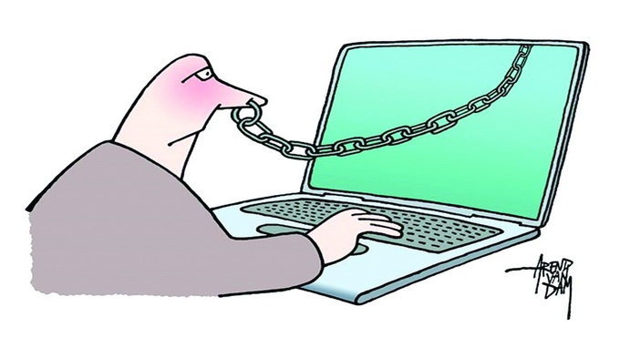 | Kết nối Bi kịch của con người thời Internet. Ai dắt mũi ai? - Biếm họa của AREND VAN DAM. |