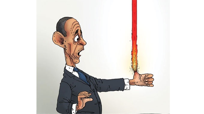 Lằn ranh đỏ của ông Obama - Tuyên bố về 'lằn ranh đỏ' và ý định can thiệp quân sự vào Syria hồi tháng 3-2013 của Tổng thống Obama năm qua không thành công! - Tranh của JOEP BERTRAMS.