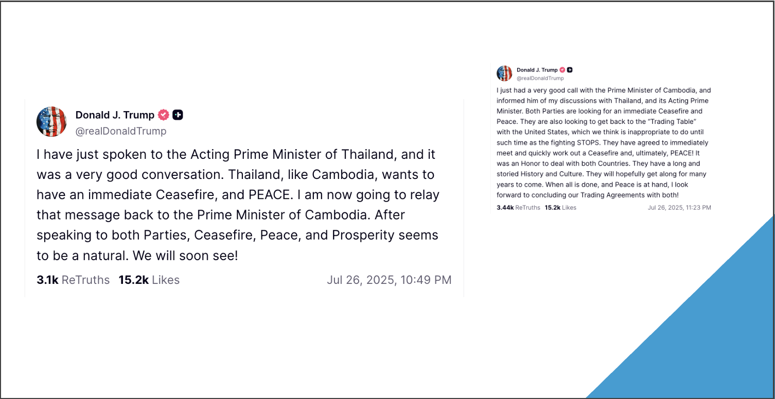 Trước khi ông Trump nói chuyện với lãnh đạo Thái Lan và Campuchia, các cuộc đụng độ ở biên giới hai nước đã bước sang ngày thứ ba, và những điểm nóng mới đã xuất hiện khi cả hai bên đều khẳng định hành động của mình là tự vệ và kêu gọi phía kia ngừng bắn, bắt đầu đàm phán.