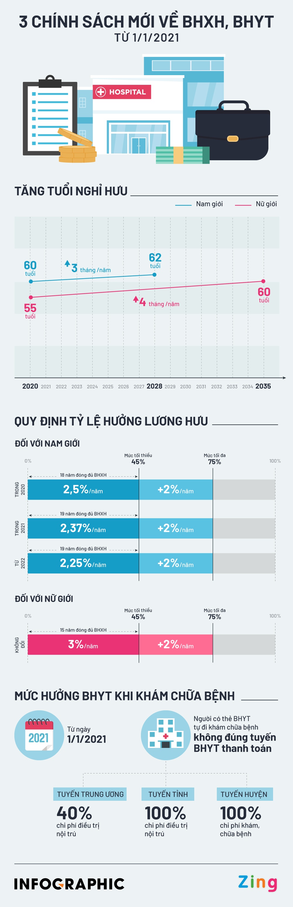 Tuổi nghỉ hưu của lao động nam từ năm 2021 là đủ 60 tuổi 3 tháng và của lao động nữ là đủ 55 tuổi 4 tháng. Sau đó mỗi năm tăng 3 tháng với nam và 4 tháng với nữ.