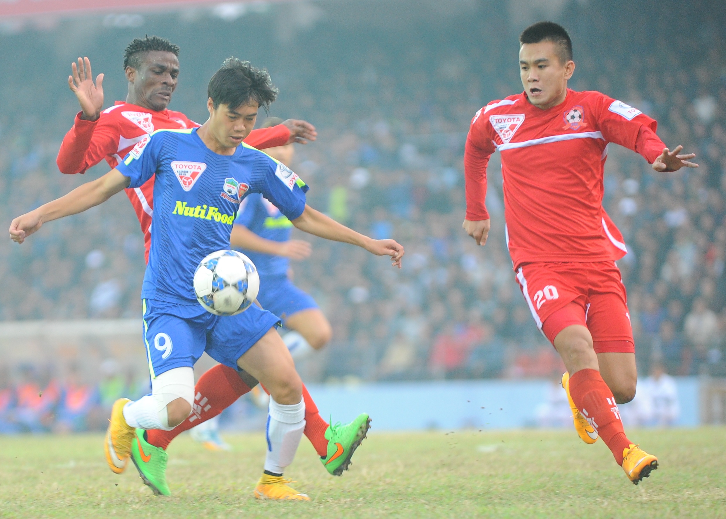 | Ngọc Thịnh (phải) thi đấu chững chạc trong màu áo CLB Hải Phòng ở mùa giải 2015. |