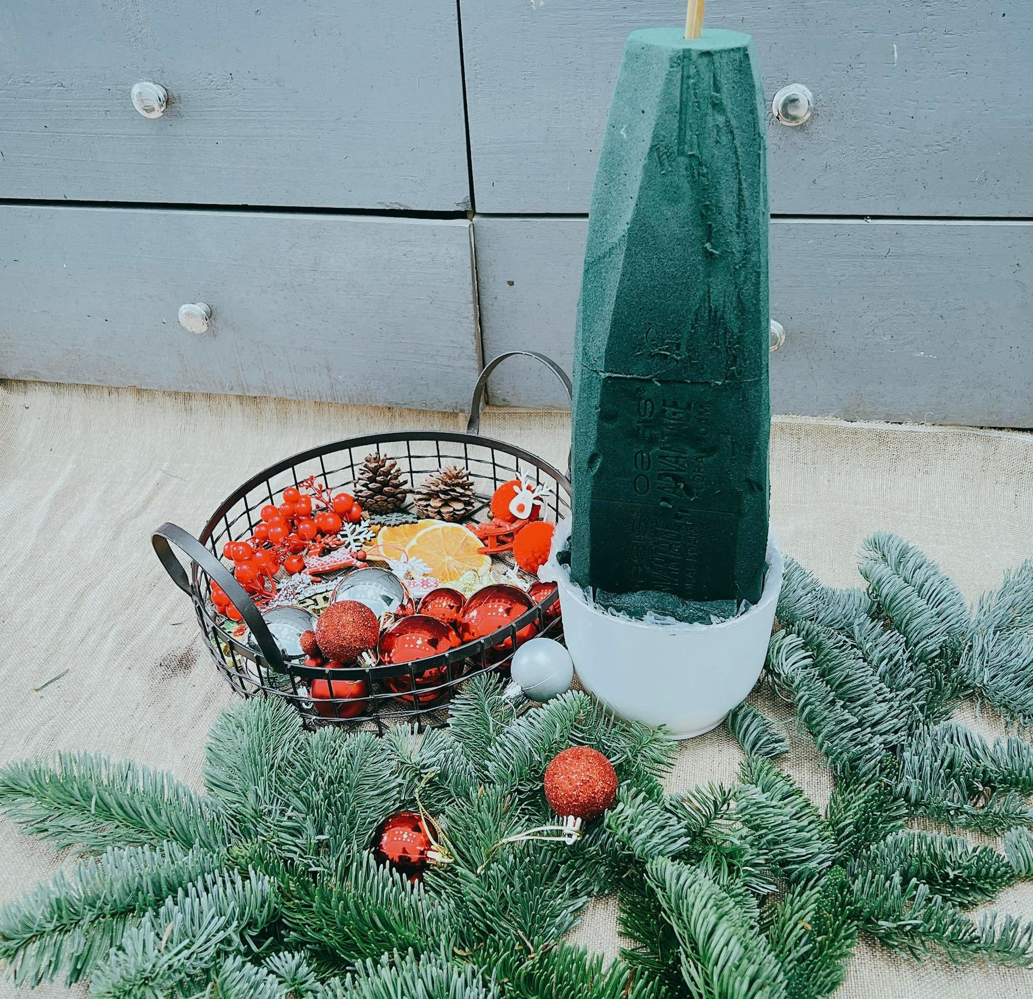 Bước 3: Đặt xốp vào chậu theo chiều thẳng đứng, nén để viên xốp chắc chắn. Cho tiếp viên xốp thứ 2 lên, lấy que tre để gắn kết hai viên xốp lại. Sau đó, cắt xốp theo hình dáng cây thông.