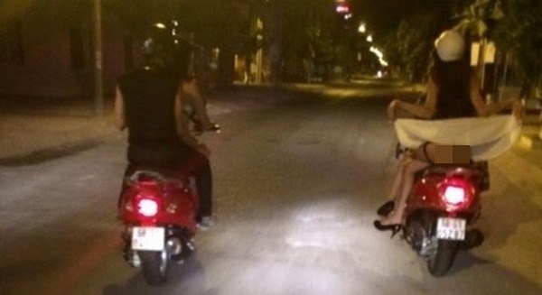 Trong đoạn clip gây xôn xao cộng đồng mạng mới nhất dài 18 giây, cô gái điệu đà mặc áo đen bó sát và chiếc váy trắng xòe, được bạn chở đi bằng xe máy giữa đêm muộn. Dù đang đi trên đường và có khá nhiều xe phía sau, nhưng cô nàng vẫn thản nhiên tốc váy nhiều lần, để lộ cả nội y mà không chút e ngại.