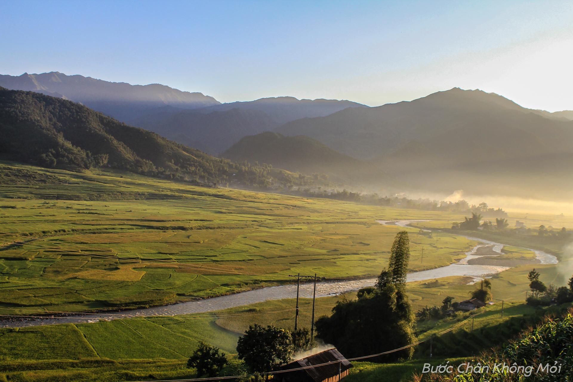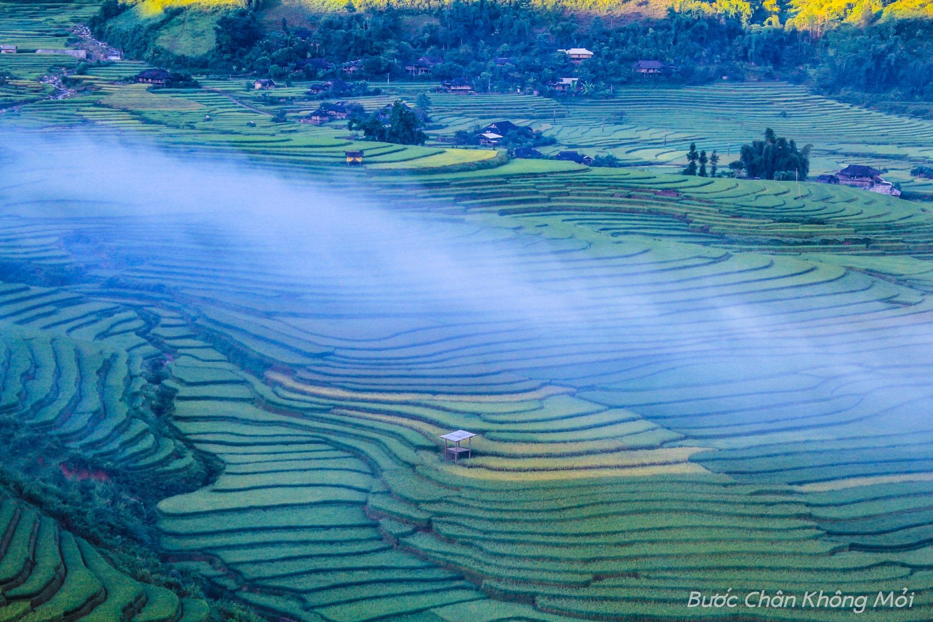 Đứng ở chân đèo, du khách đã có thể chiêm ngưỡng những nương ruộng bậc thang chín vàng ở Tú Lệ mờ ảo trong làn sướng sớm. |
