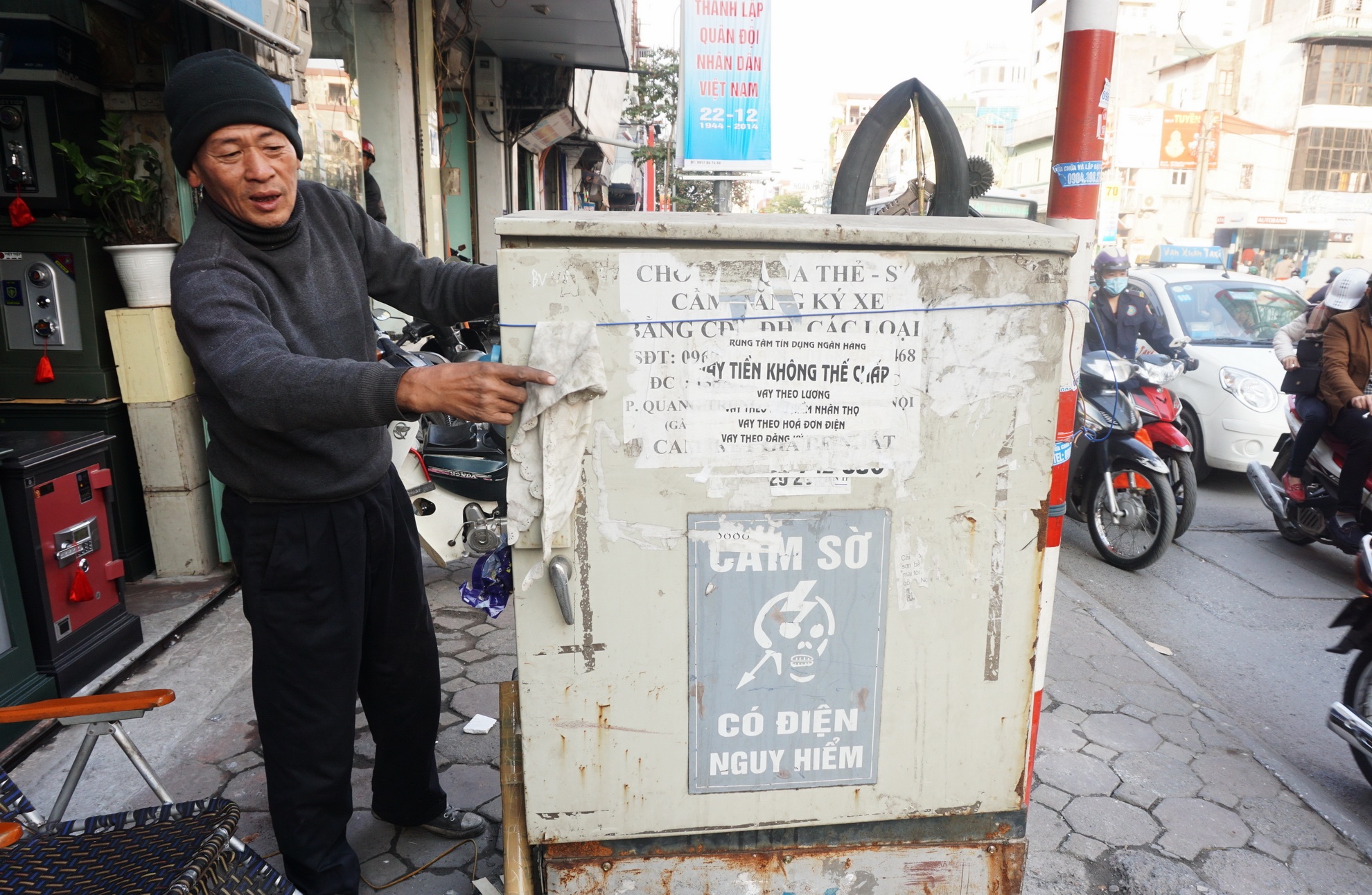 | Tủ điện cạnh một điểm đỗ xe buýt công cộng. Ngân Bình, sinh viên ĐH Tự nhiên cho biết: "Ngày nào em cũng phải đứng ở đây, rất sợ". |