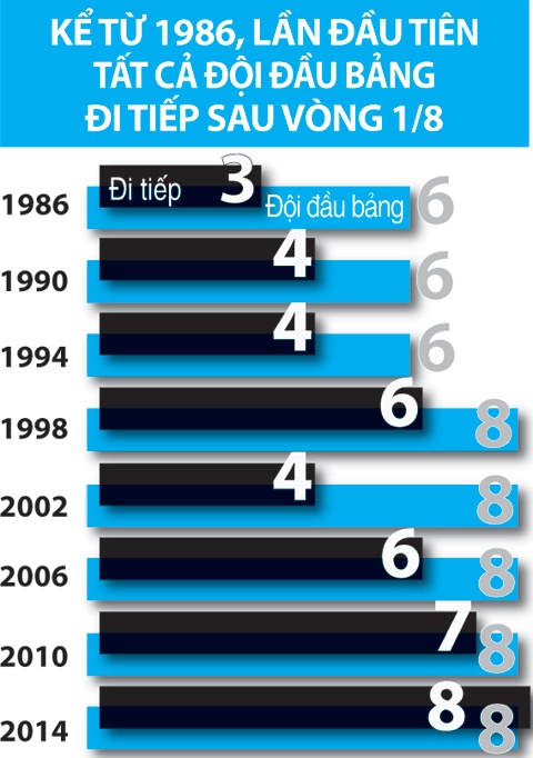 Logic mà tư duy, vị thế nhất bảng về cơ bản đã xác tín được đẳng cấp của 8 đội tuyển, và việc họ không tạo cơ hội cho bất kỳ đối thủ chiếu dưới nào làm nên bất ngờ ở vòng 1/8 cho thấy, không hề có dấu hiệu của sự hụt hơi ở 8 đại diện đã có được màn chạy đà hoàn hảo ấy.