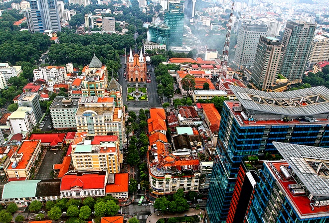 Sài Gòn, khu vực Hội trường Thống Nhất ngắm từ trên không trung khác hẳn với khi được nhìn ngang, nhìn dọc, hay nhìn từ…dưới nhìn lên, đó là một Sài Gòn với những chấm đỏ - mái của những ngôi nhà, thắm như những nụ hoa. Tươi và ấm vậy, sao không yêu cho được, Sài Gòn? Ảnh: Hội trường Thống Nhất.