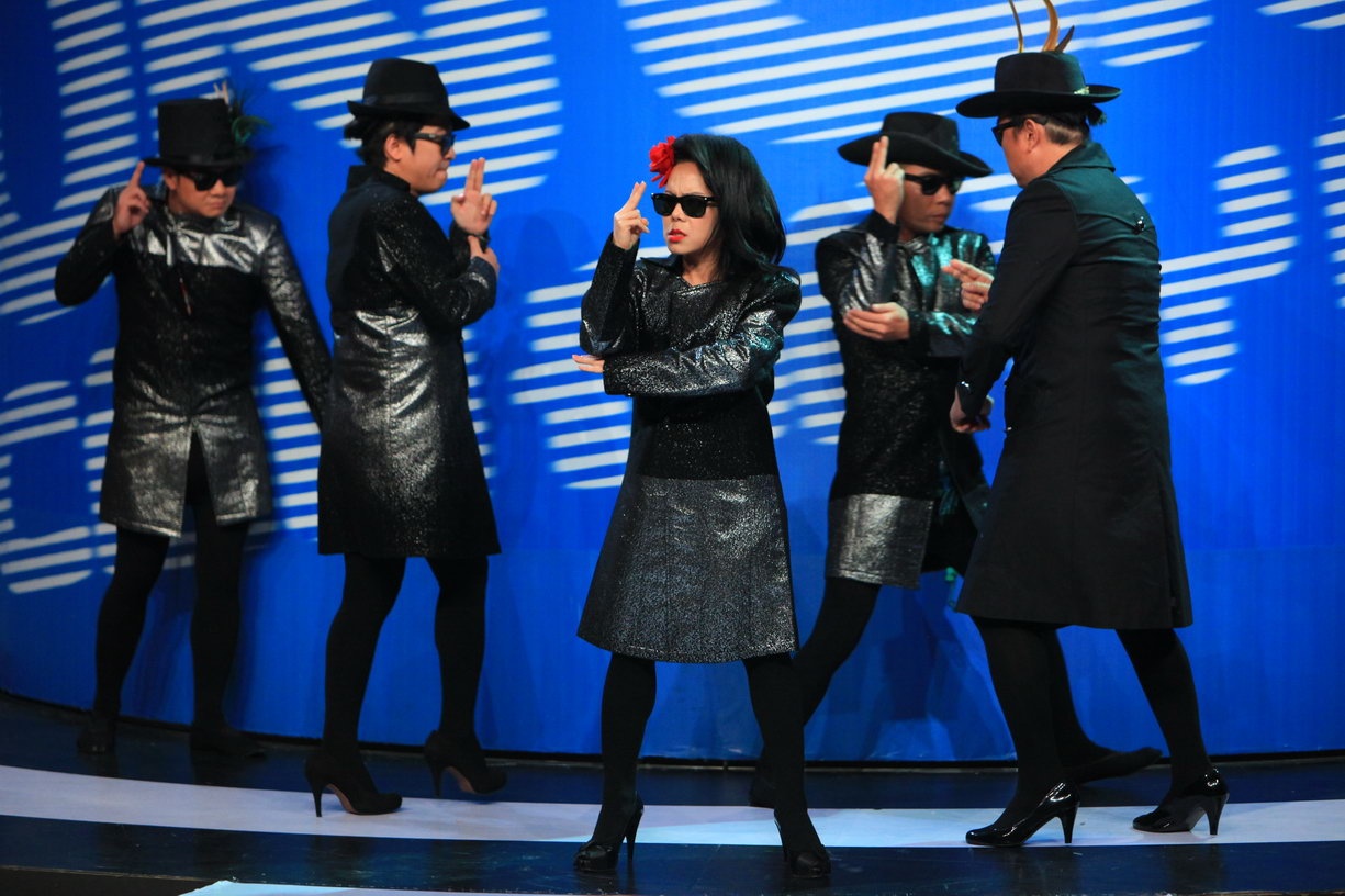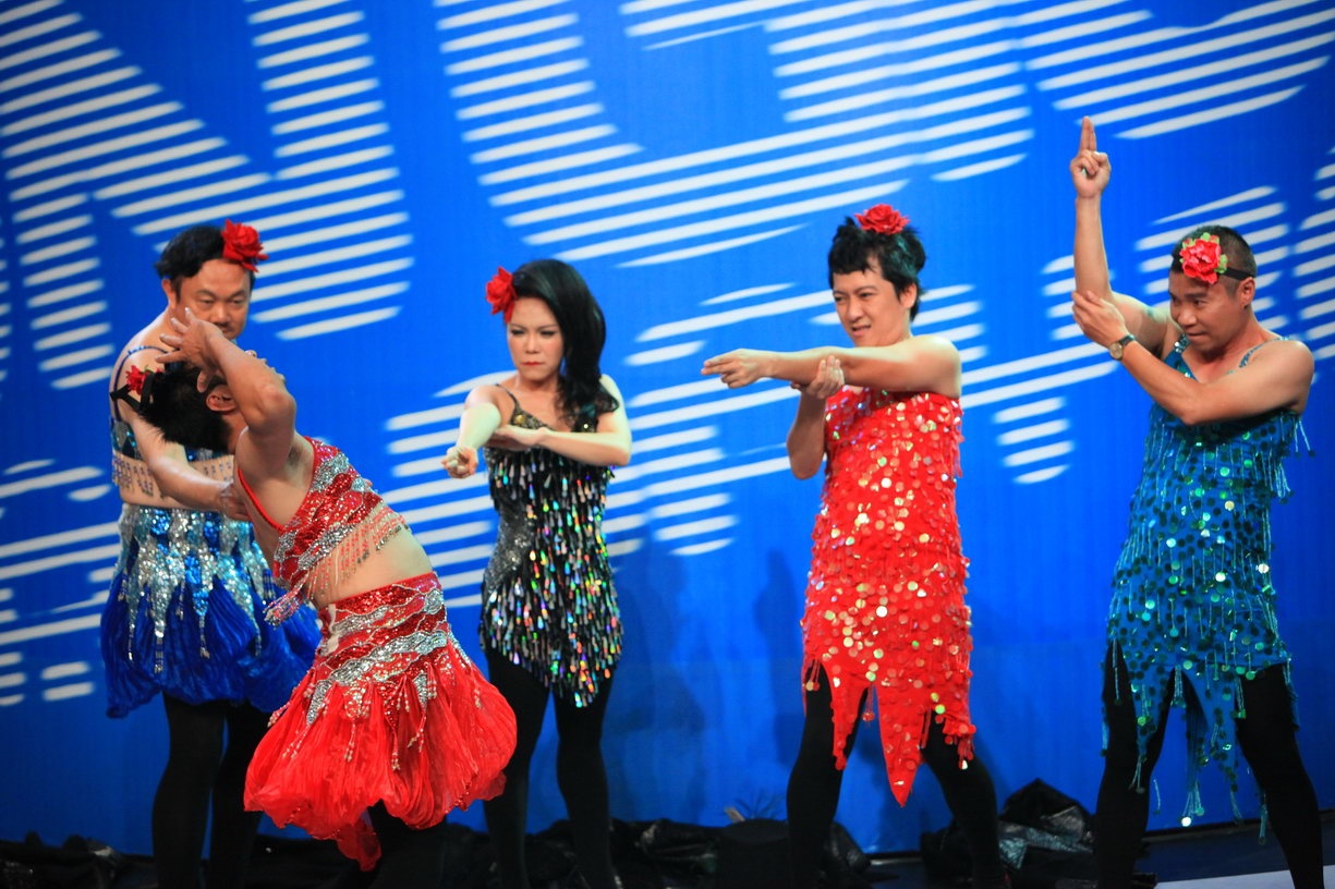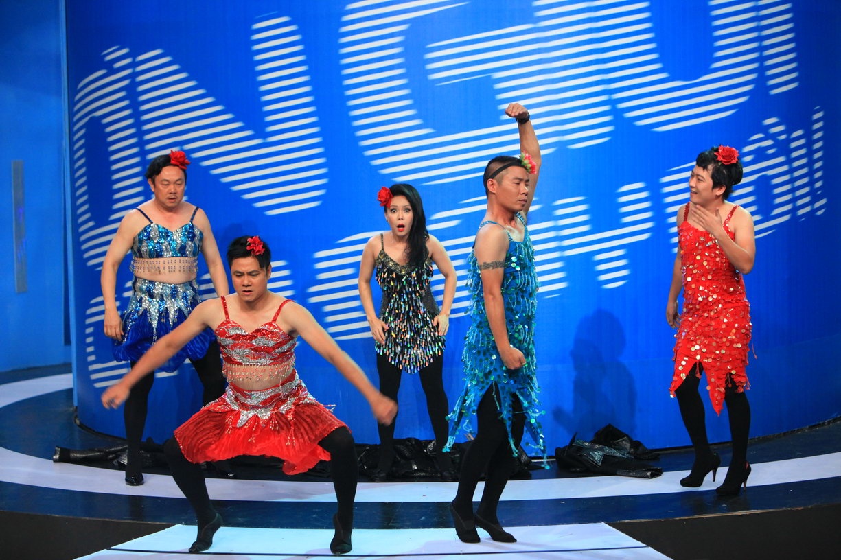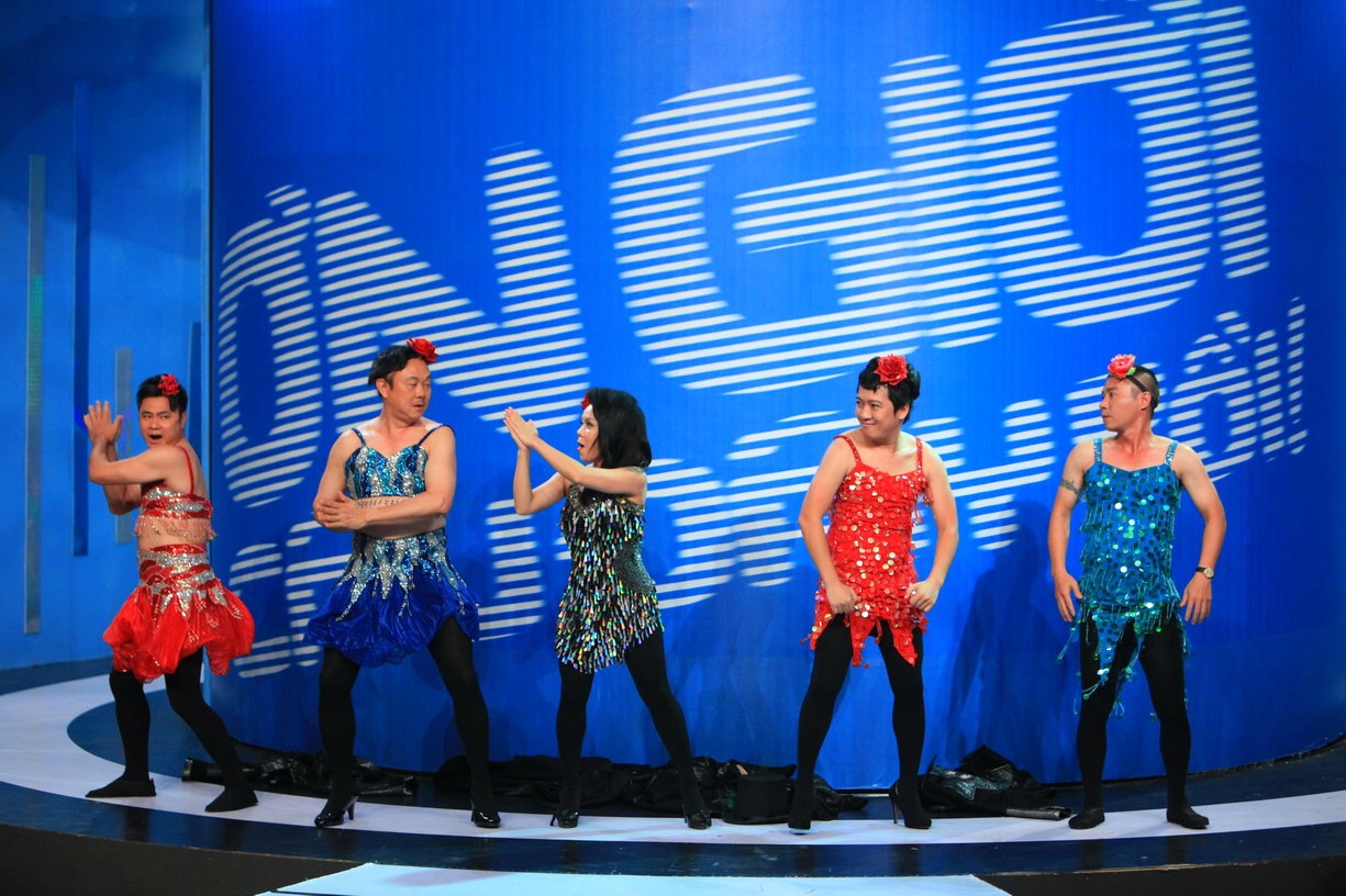 Để tăng độ hài hước cho tiết mục, 5 vị trưởng phòng phải cài lên đầu những bông hoa hồng lớn.