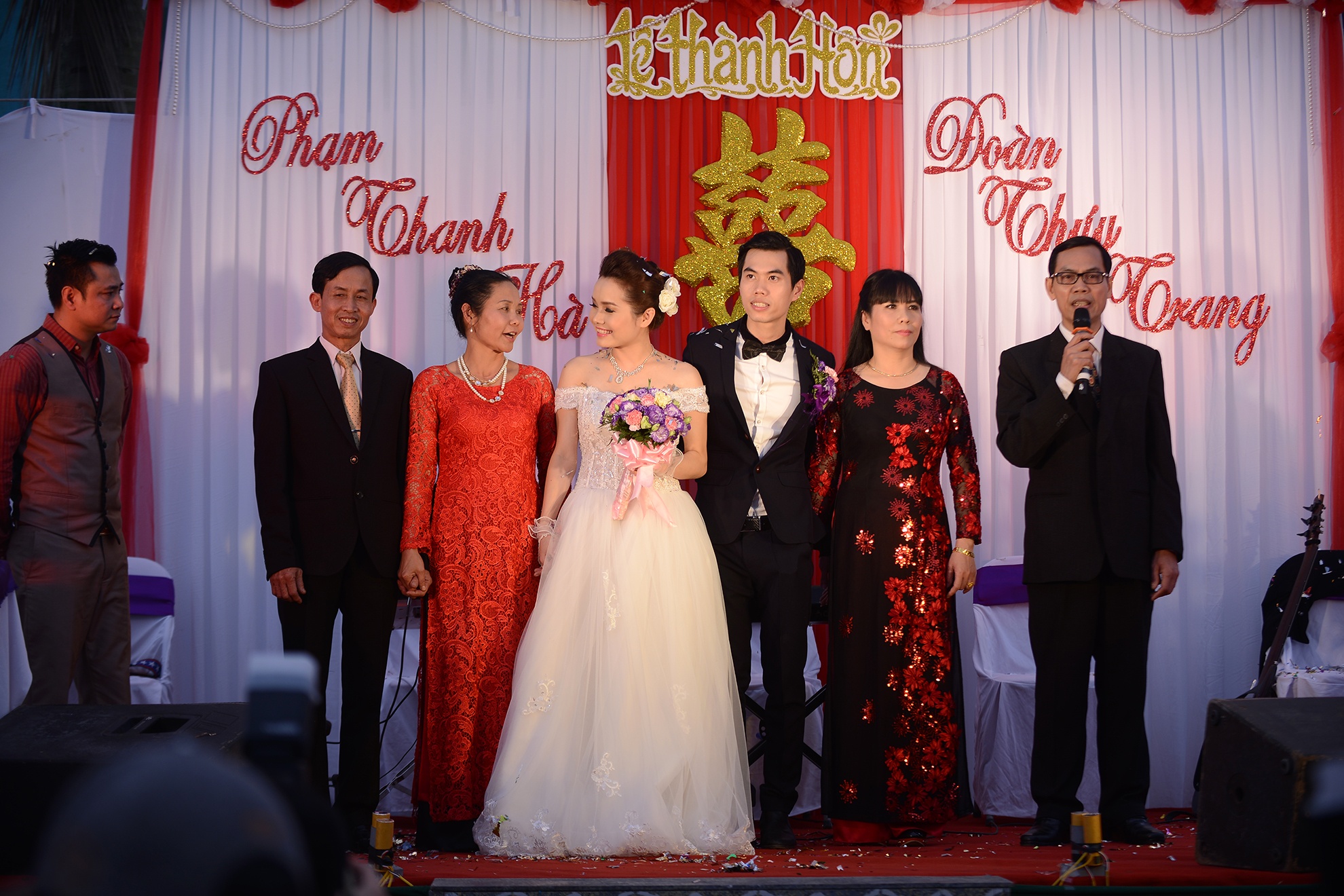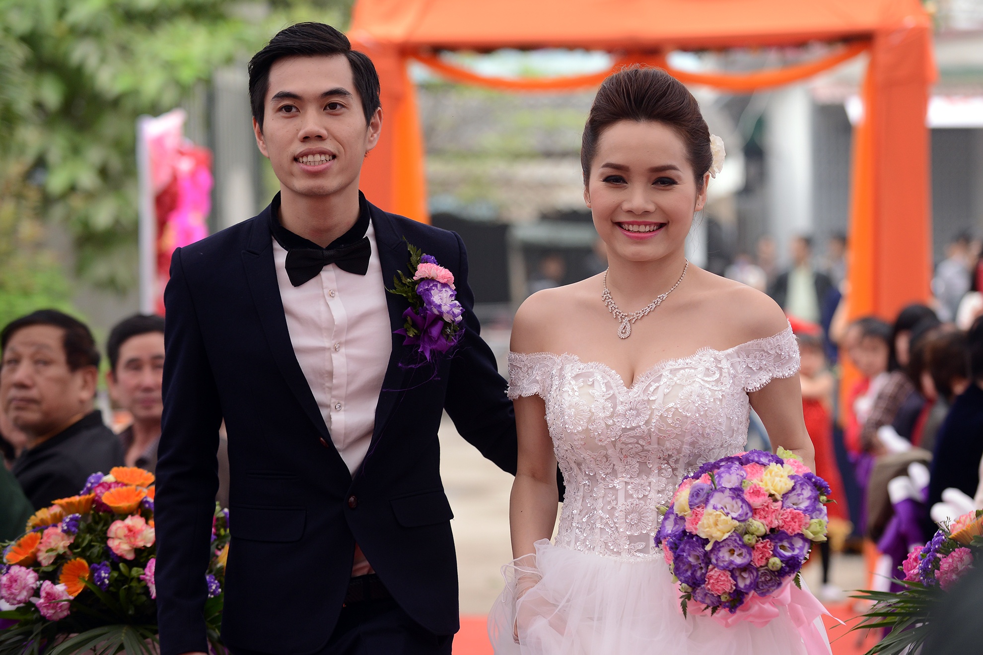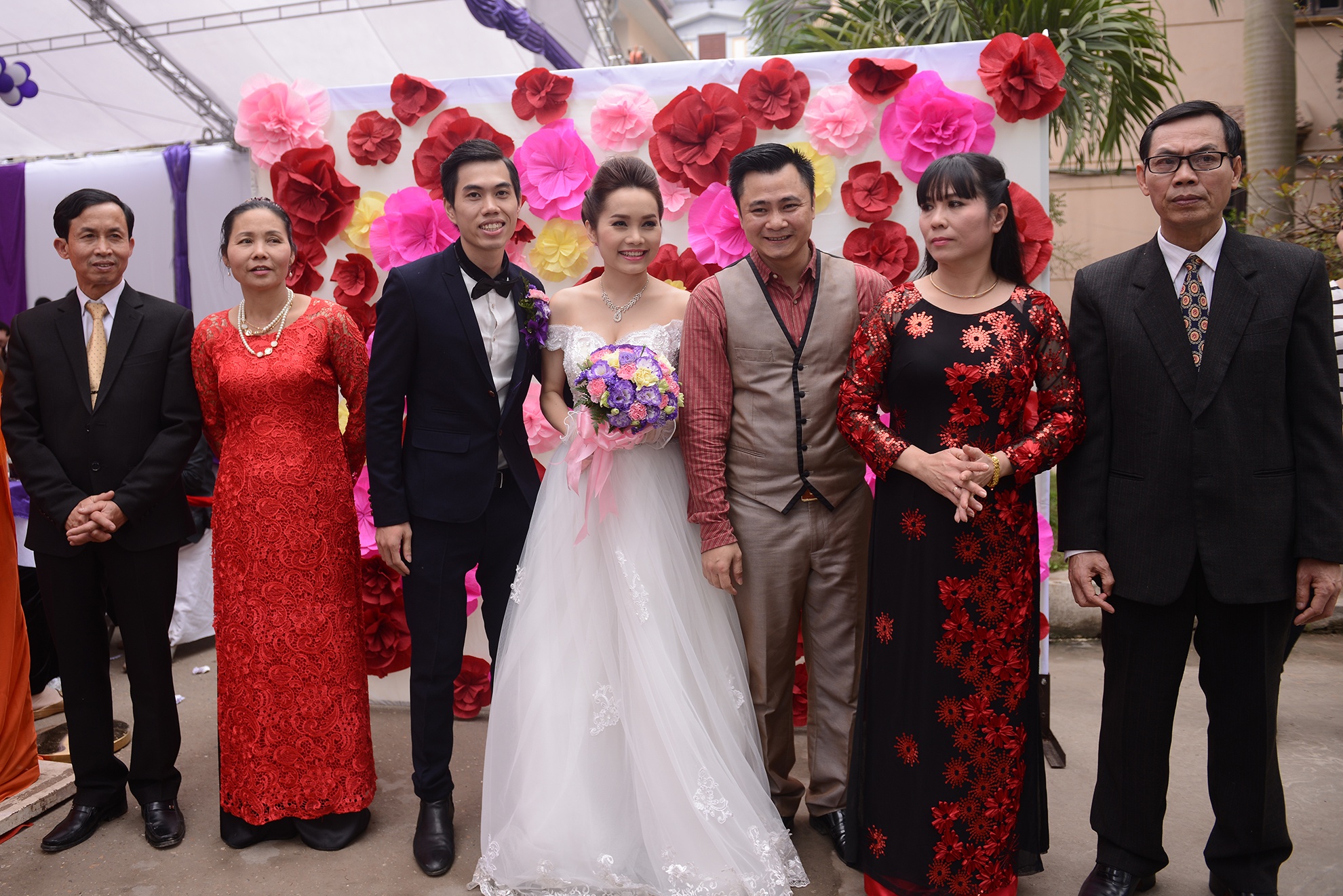 | Tự Long cũng trêu đùa khiến Thanh Hà và Thúy Trang ngại ngùng khi trao nhau nụ hôn hạnh phúc trước sự chứng kiến của gia đình và bạn bè thân thiết. Hôn lễ của cặp trai tài gái sắc được tổ chức khá đơn giản nhưng ấm cúng. |