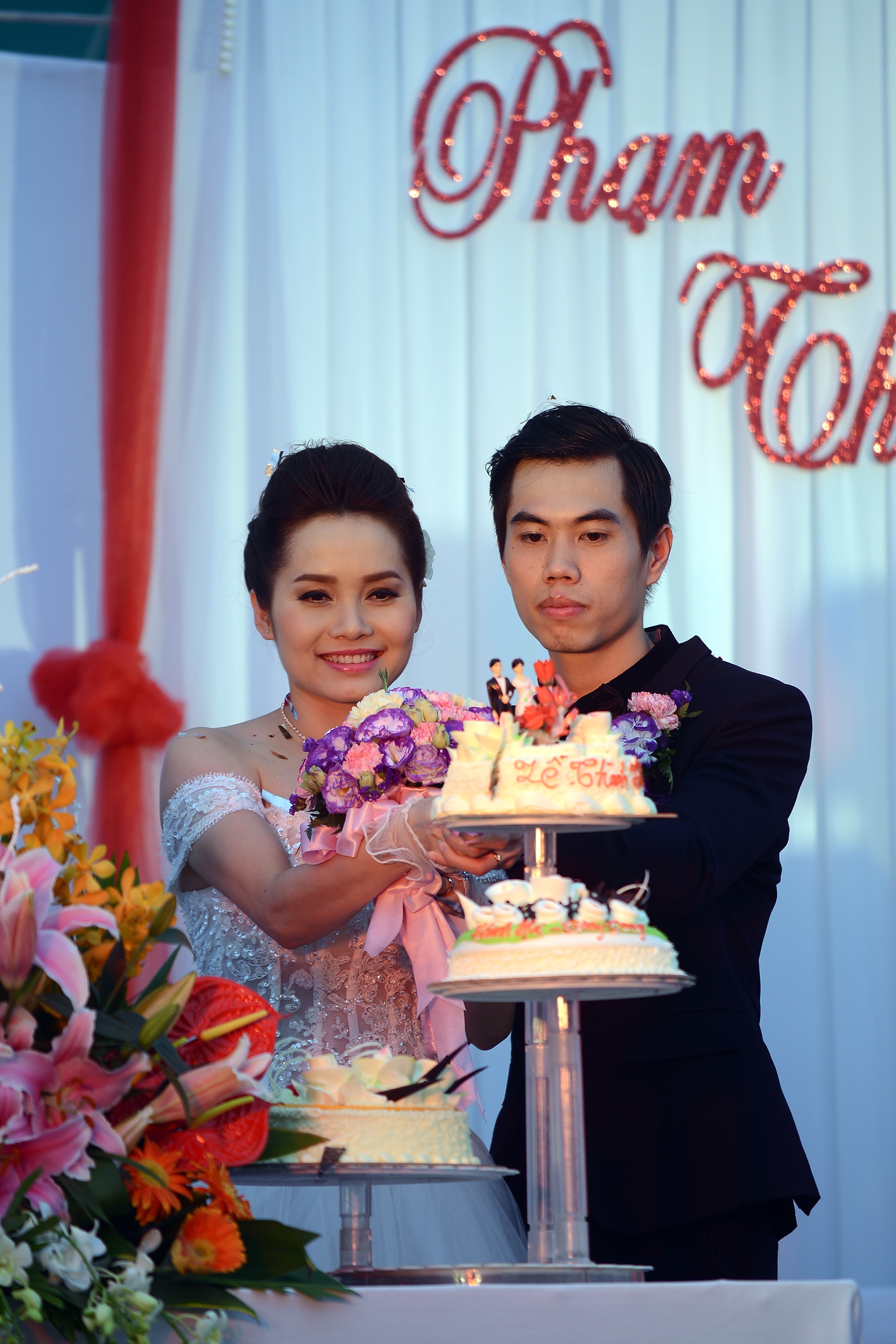 | Khoảnh khắc cặp đôi tình tứ cắt bánh. |