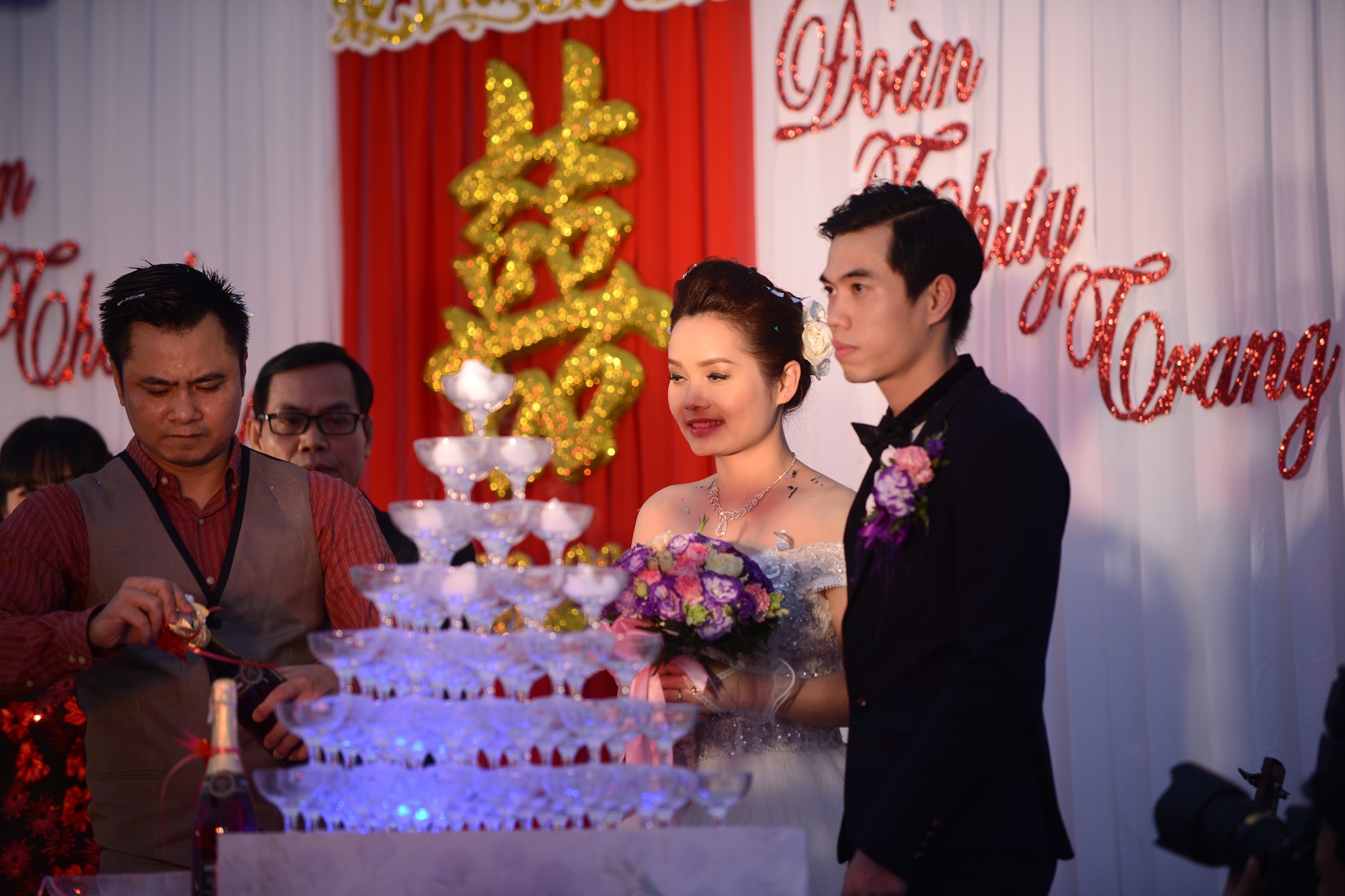 | Tự Long giúp cặp đôi mở chai rượu hồng để rót mừng hạnh phúc. |
