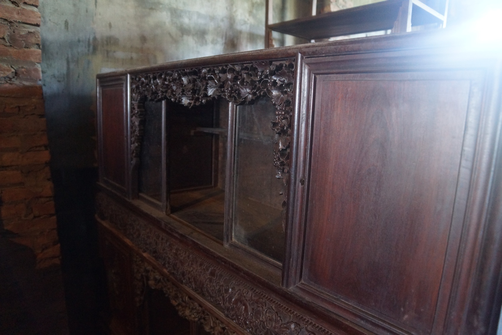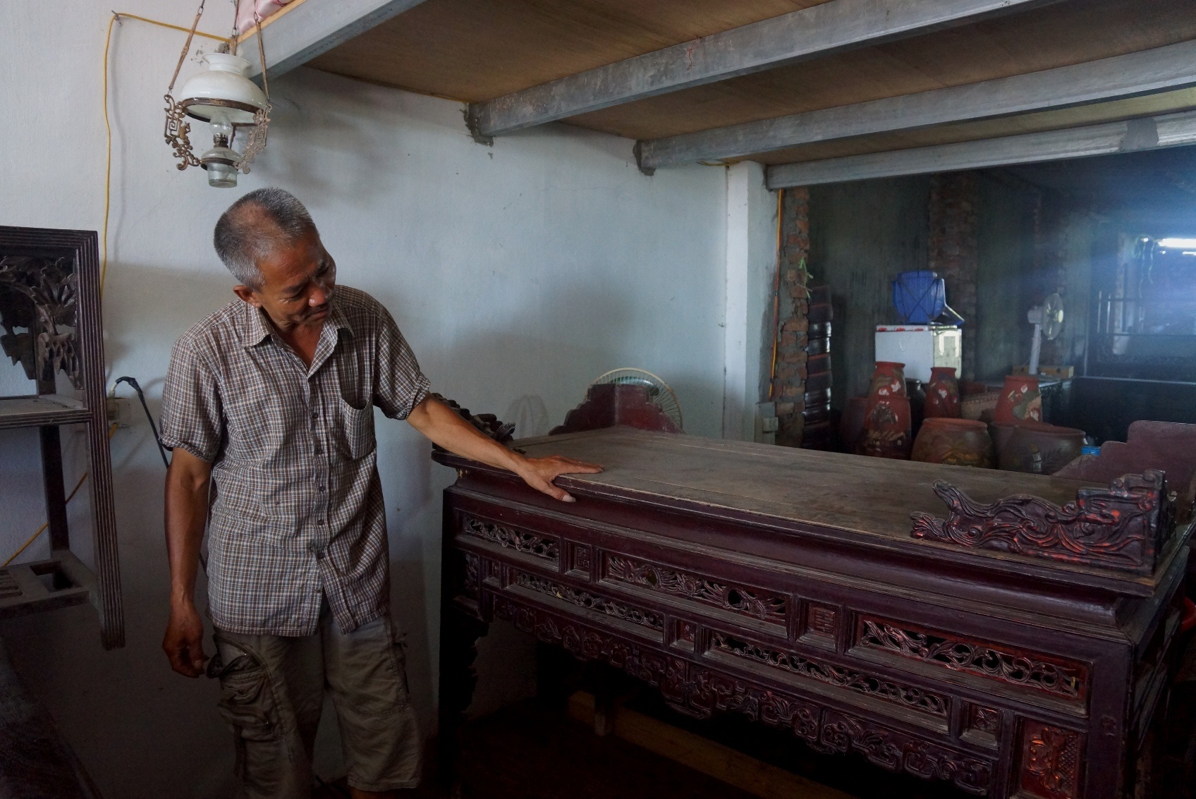 | Ông Ngọc cho biết, ngoài chum vại thì mặt hàng thu lãi khủng kế tiếp chính là đồ gỗ bao gồm bàn ghế, sập gụ tủ chè, tràng kỷ, hoành phi câu đối, án gian... Chia sẻ một cách đầy hăng say và sung sướng, ông Ngọc tiết lộ: "Nghề của tôi là cái nghề mua của người chán, bán cho người thèm. Nhưng sướng nhất ở chỗ: người chán ở đây lại là những người không am hiểu về đồ cổ và giá trị của nó nên sẵn sàng bán đi với giá rất rẻ còn người mua lại là những chuyên gia hoặc đại gia sẵn sàng bỏ cả đống tiền. Còn riêng tôi, ban đầu tôi dựa vào vận may, giờ có tí kinh nghiệm thì tôi dựa vào cả kinh nghiệm lùng đồ, định giá và khiếu kinh doanh". Như chiếc án gian cổ này, ông Ngọc tiết lộ, nó có tuổi hơn 200 năm, được ông mua của một nhà ở Yên Sở (Hoài Đức, Hà Nội) với giá vài triệu và rao bán hơn 100 triệu. Ông khẳng định, đó là giá buôn, nếu nhiều khách đấu giá, có khi bán được gấp đôi như vậy. |