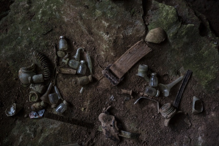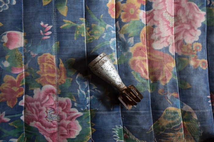 Một phần của trái bom tại nhà ông Van Kham, 85 tuổi. Ông từng là một người thu nhặt kim loại trong vài năm sau khi chiến tranh kết thúc. Gia đình ông trở về khu vực Na Kuan sau khi sống 7 năm trong trại tị nạn. Khi trở về, họ phát hiện một khu vực rải rác bom chùm và pháo cối.