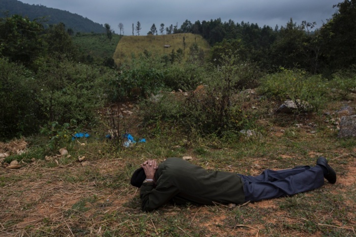 Ông Kampuang Dalaseng, 84 tuổi, nằm trên mặt đất diễn lại cách ông tránh bom trong chiến tranh. "Tôi ghét người Mỹ kể từ ngày ấy. Họ đánh bom, đốt cháy và phá hủy mọi thứ. Nếu tổng thống của họ ở đây, tôi sẽ tát vào mặt ông ta", Dalaseng nói.