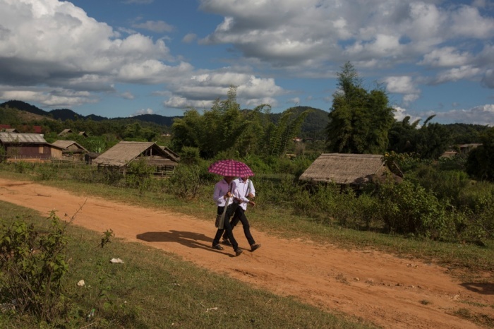 | Học sinh tại làng Nông Tặng, tỉnh Xieng Khouang, đi bộ trên con đường, nơi từng là đường băng Lima Site L-108 do CIA sử dụng trong suốt cuộc chiến 40 năm trước. |